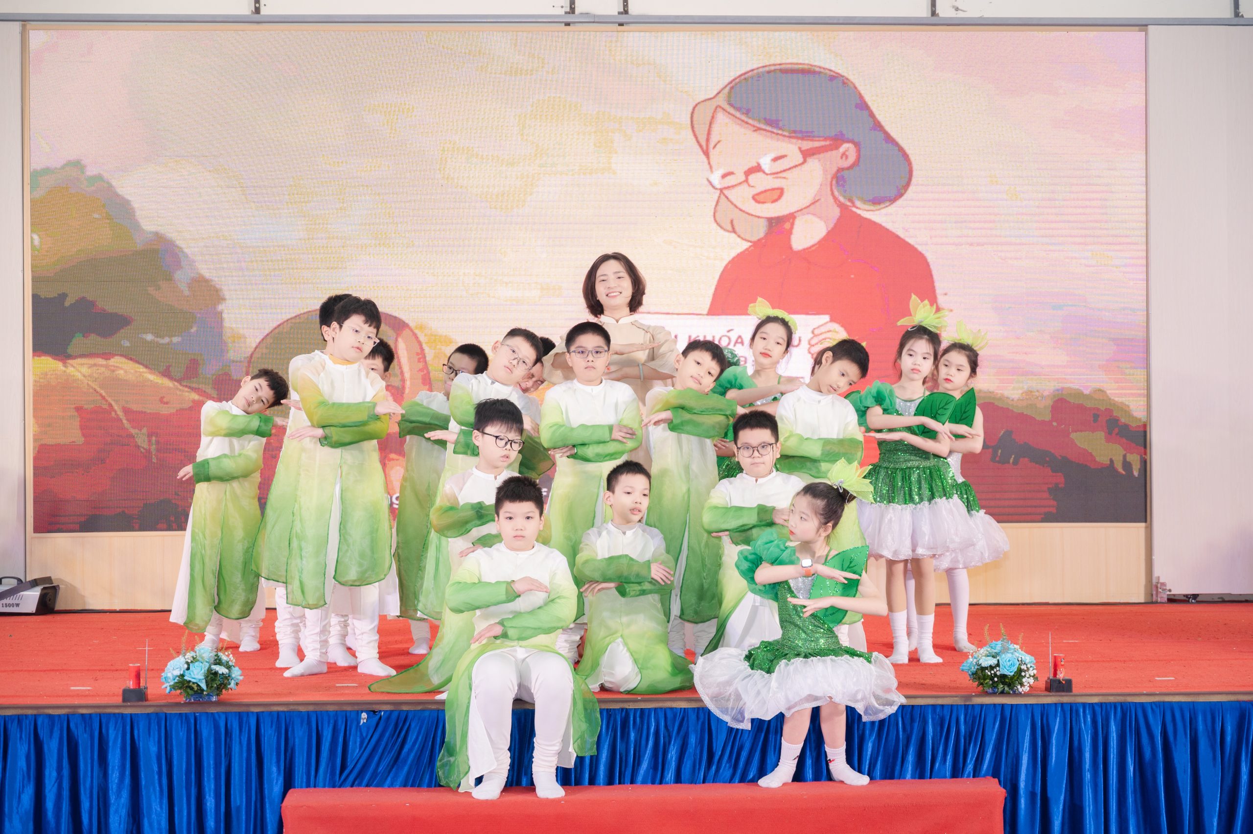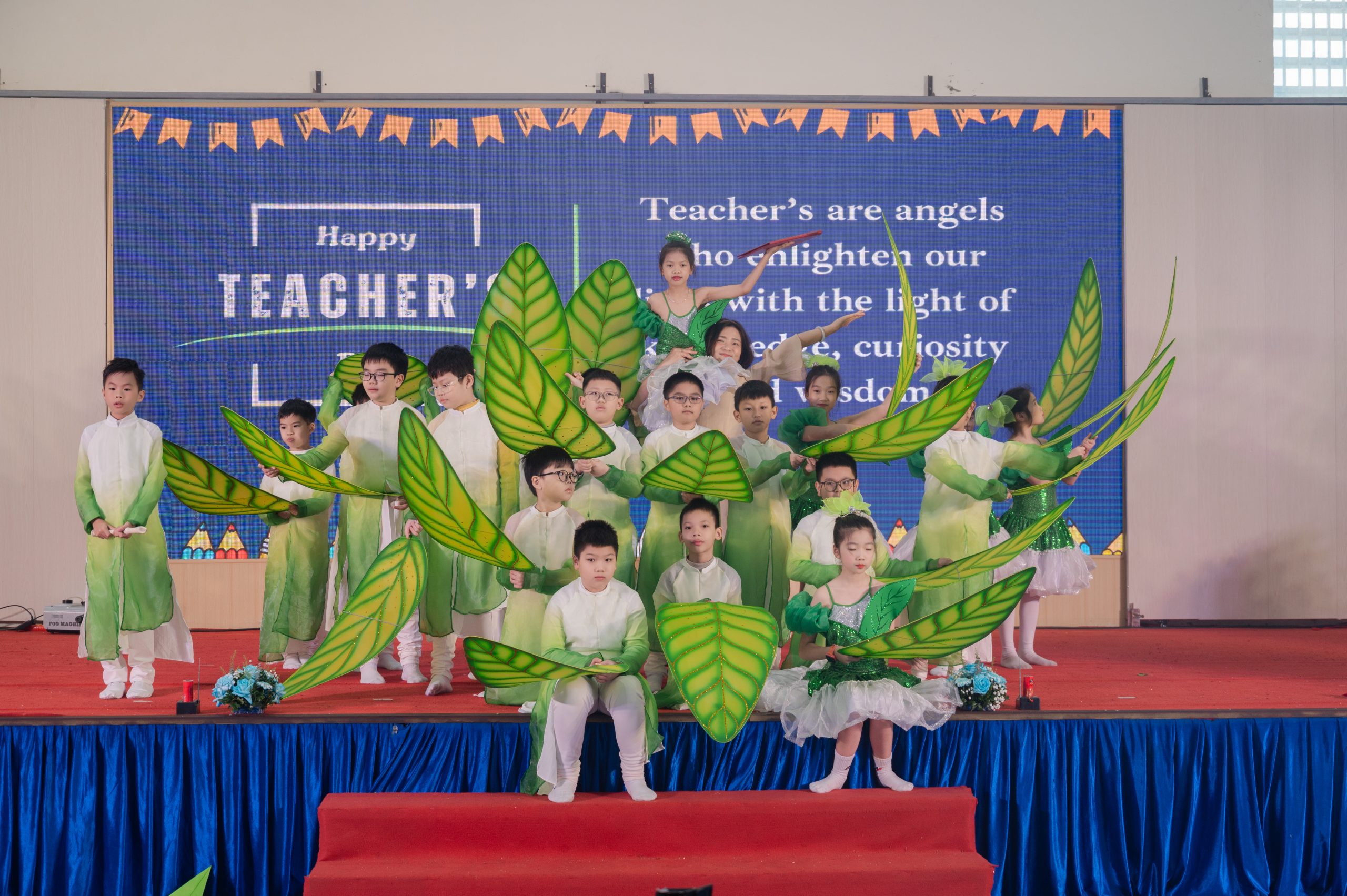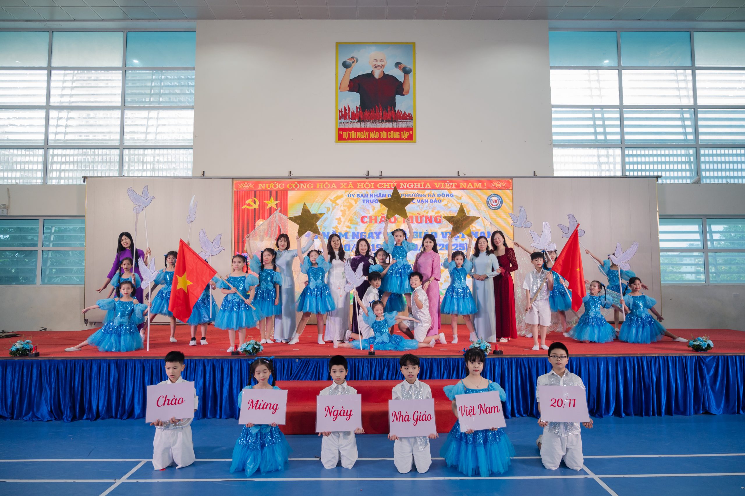 Mở đầu chương trình là nghi thức chào cờ trang nghiêm, thể hiện niềm tự hào và tinh thần đoàn kết của toàn trường. Tiếp đó, các em học sinh đã mang đến những tiết mục văn nghệ tươi vui, ý nghĩa nhằm tri ân các thầy cô giáo.