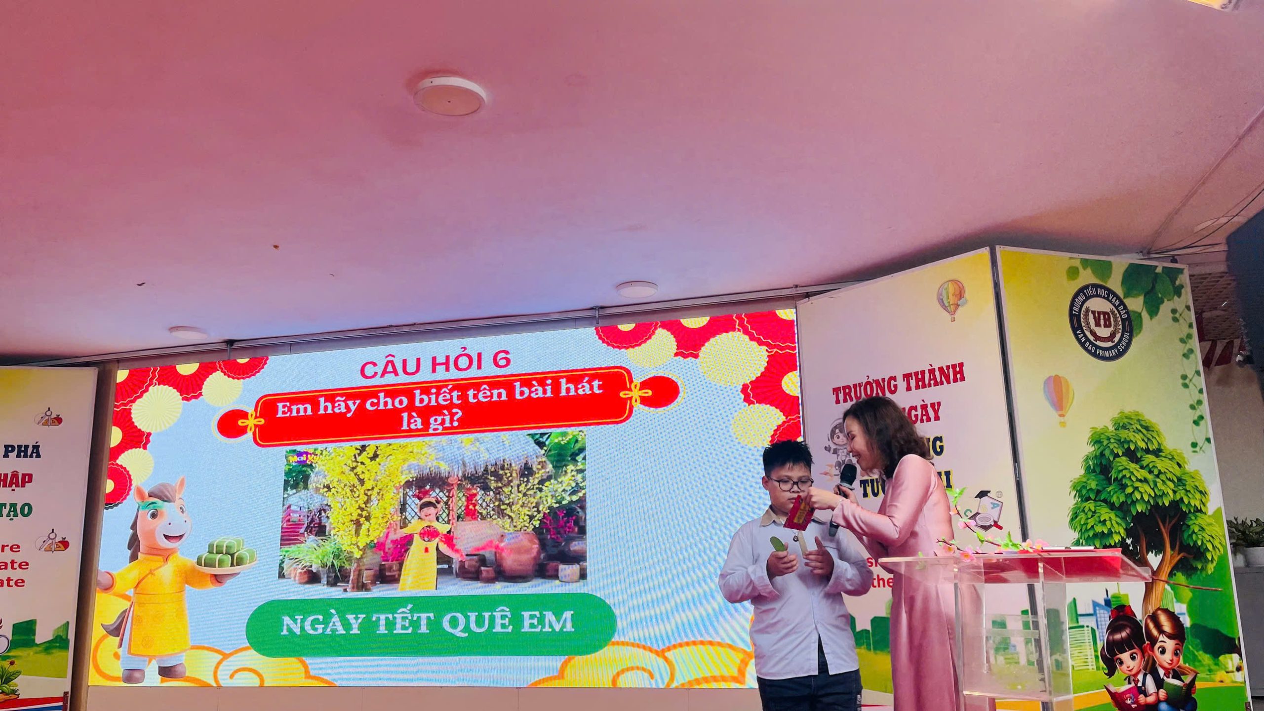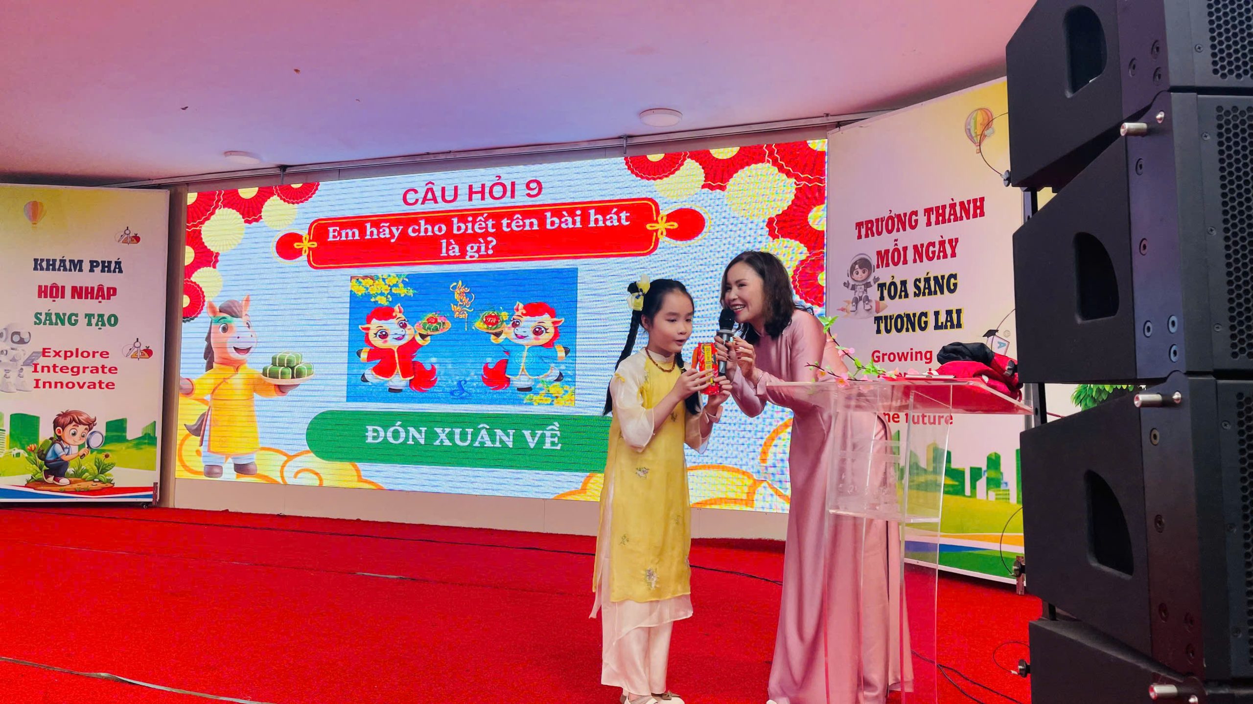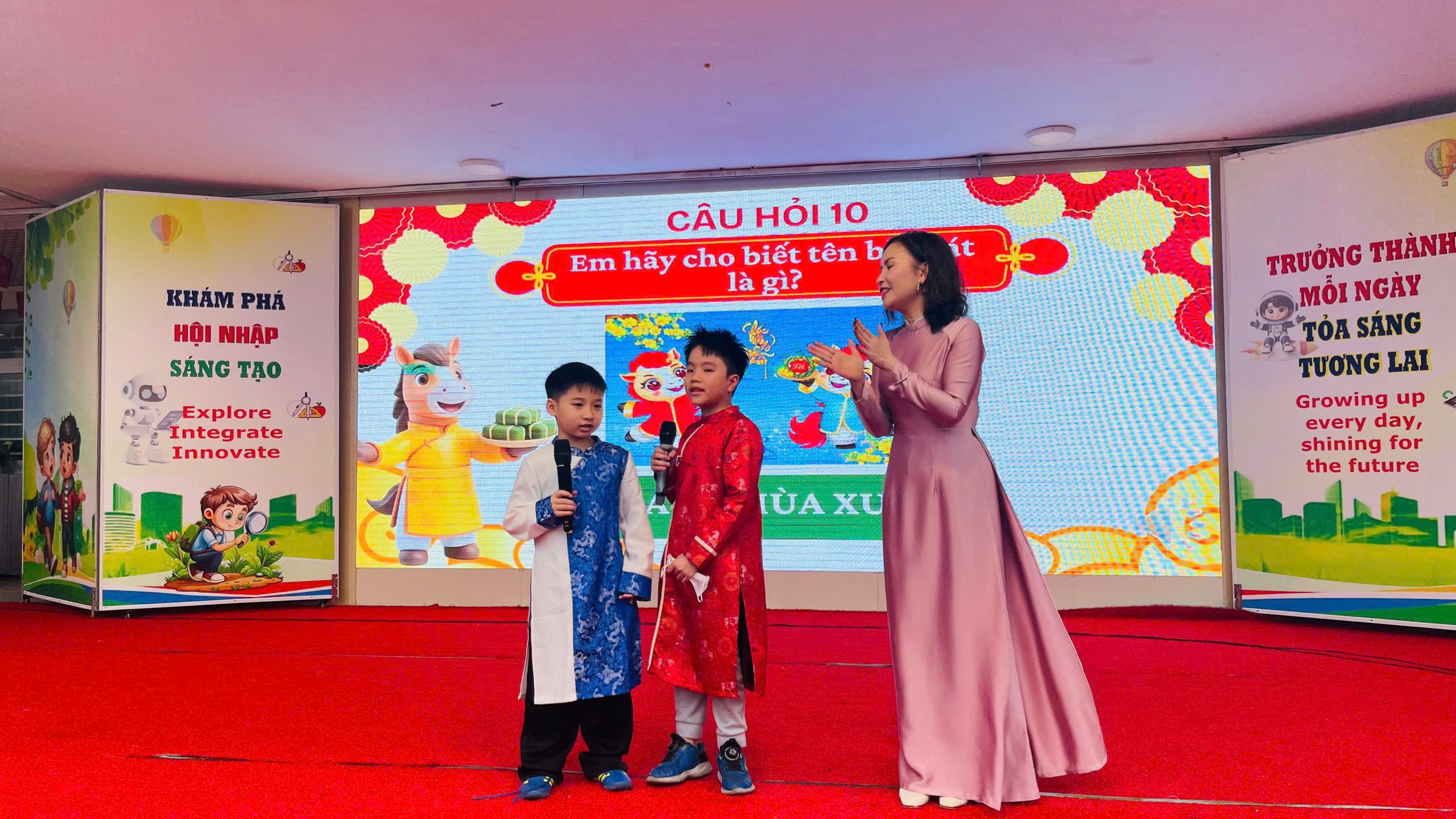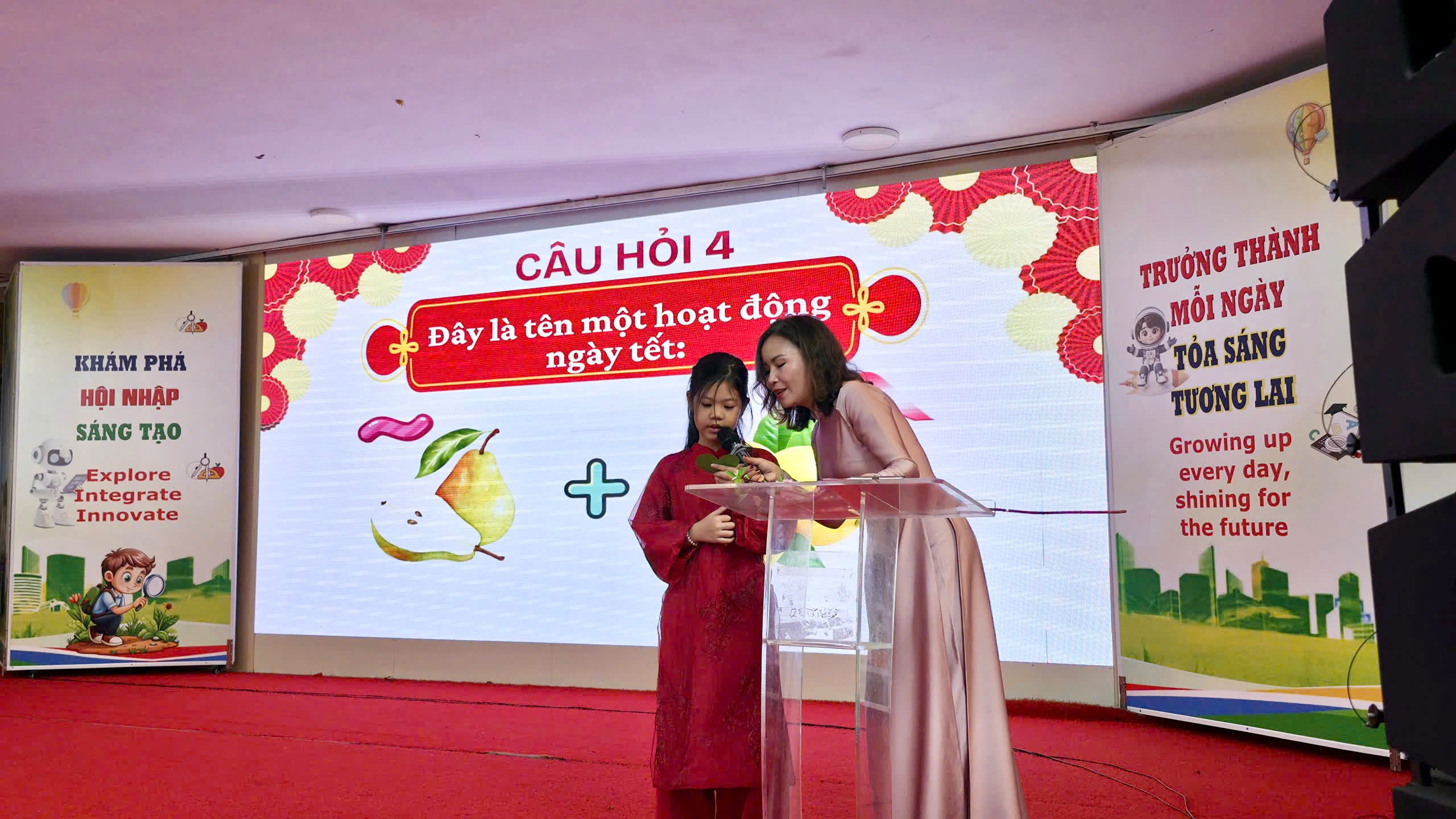 Phần thi câu đố vui nhận được sự hưởng ứng nhiệt tình từ các em học sinh. Những câu hỏi thú vị về ngày Tết, phong tục truyền thống và kiến thức đời sống đã giúp các em vừa học vừa chơi, mở rộng hiểu biết trong tiếng cười sôi nổi.