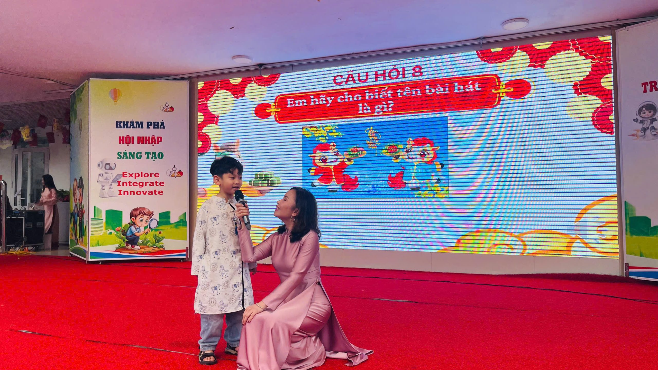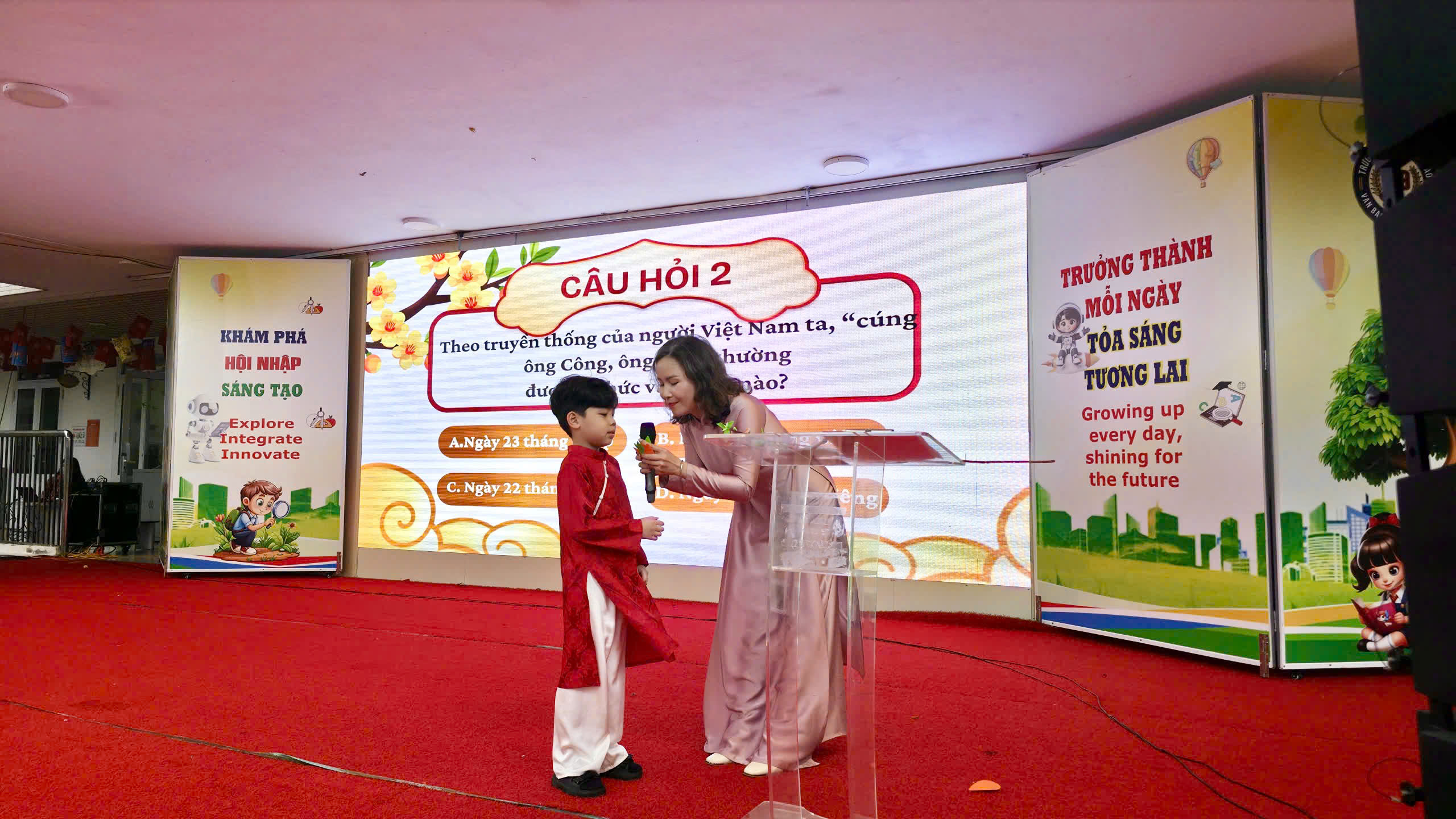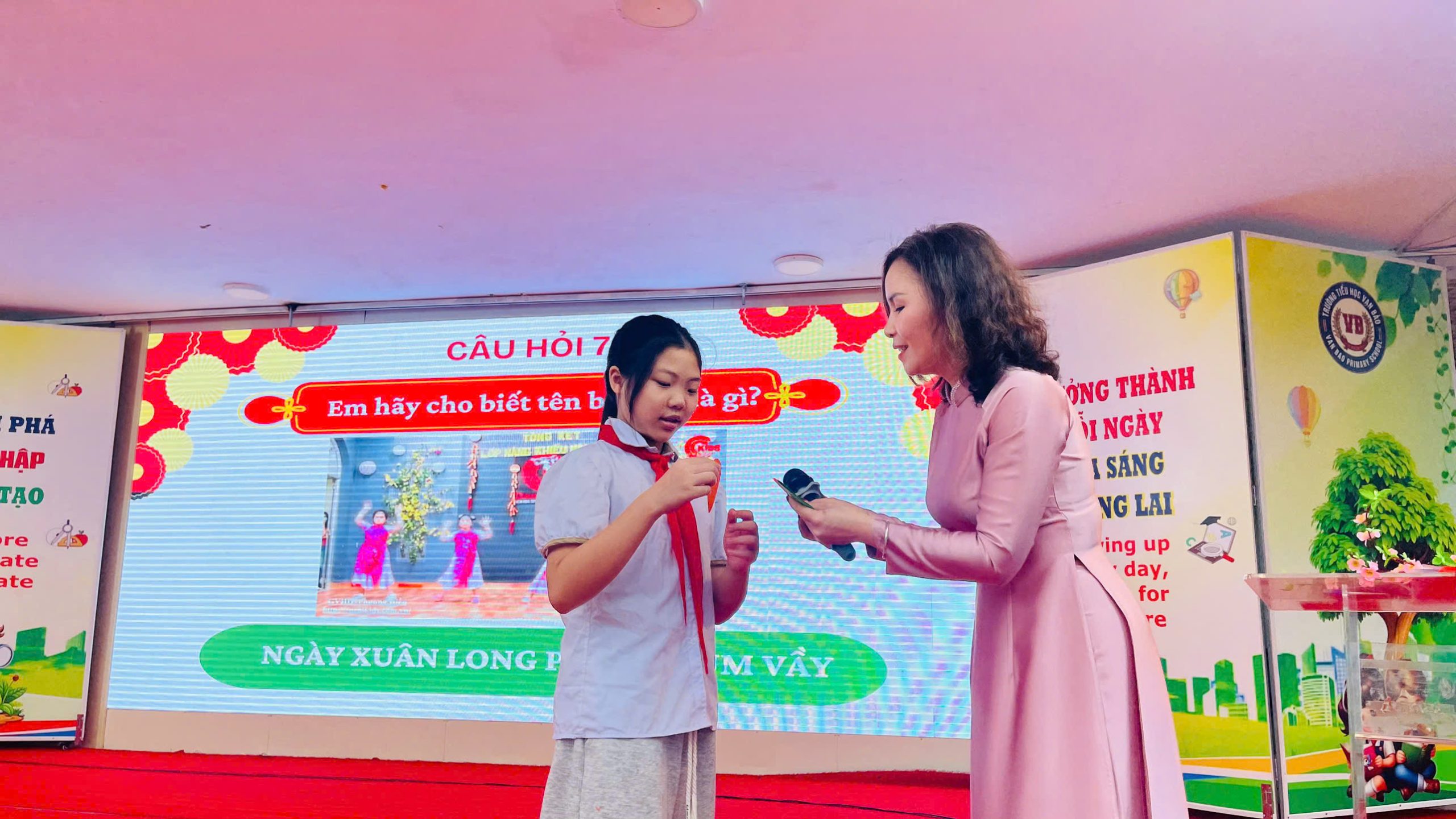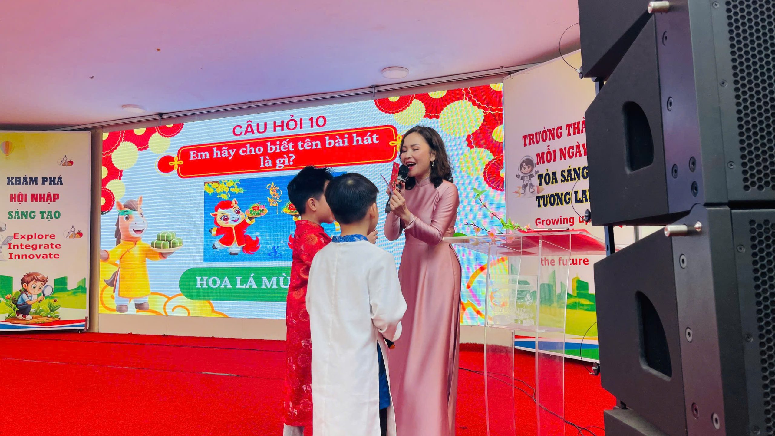 Phần thi câu đố vui nhận được sự hưởng ứng nhiệt tình từ các em học sinh. Những câu hỏi thú vị về ngày Tết, phong tục truyền thống và kiến thức đời sống đã giúp các em vừa học vừa chơi, mở rộng hiểu biết trong tiếng cười sôi nổi.