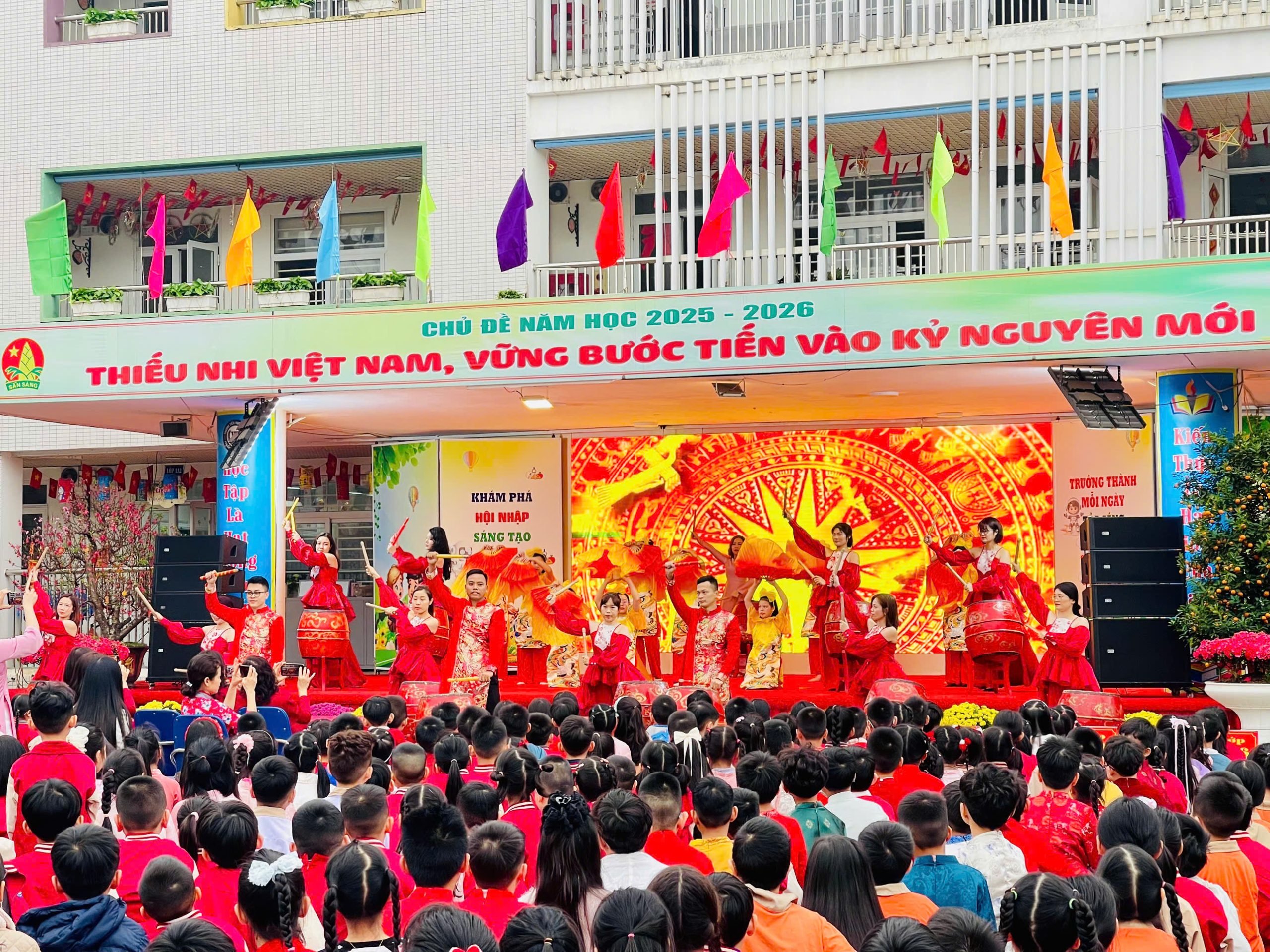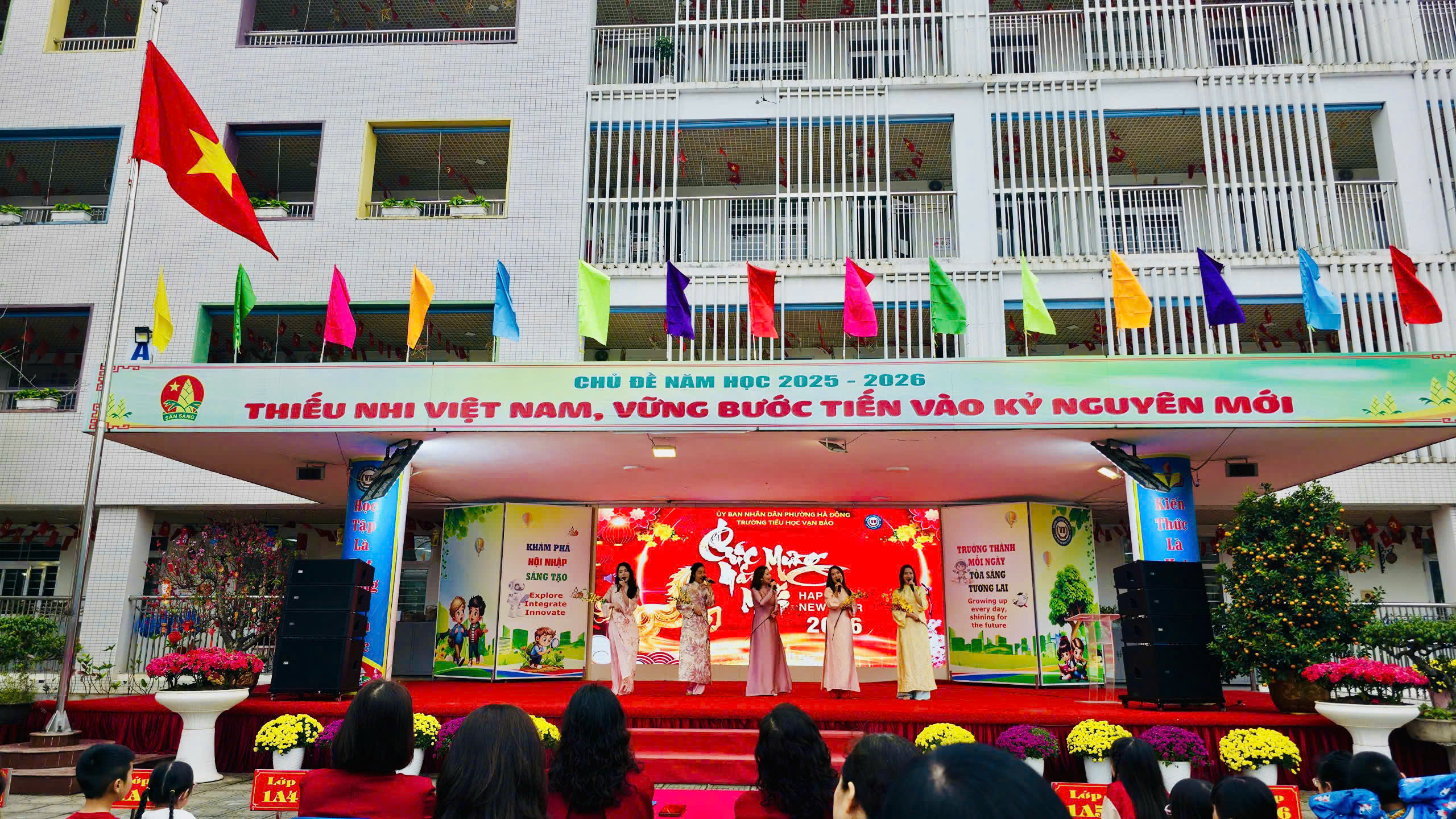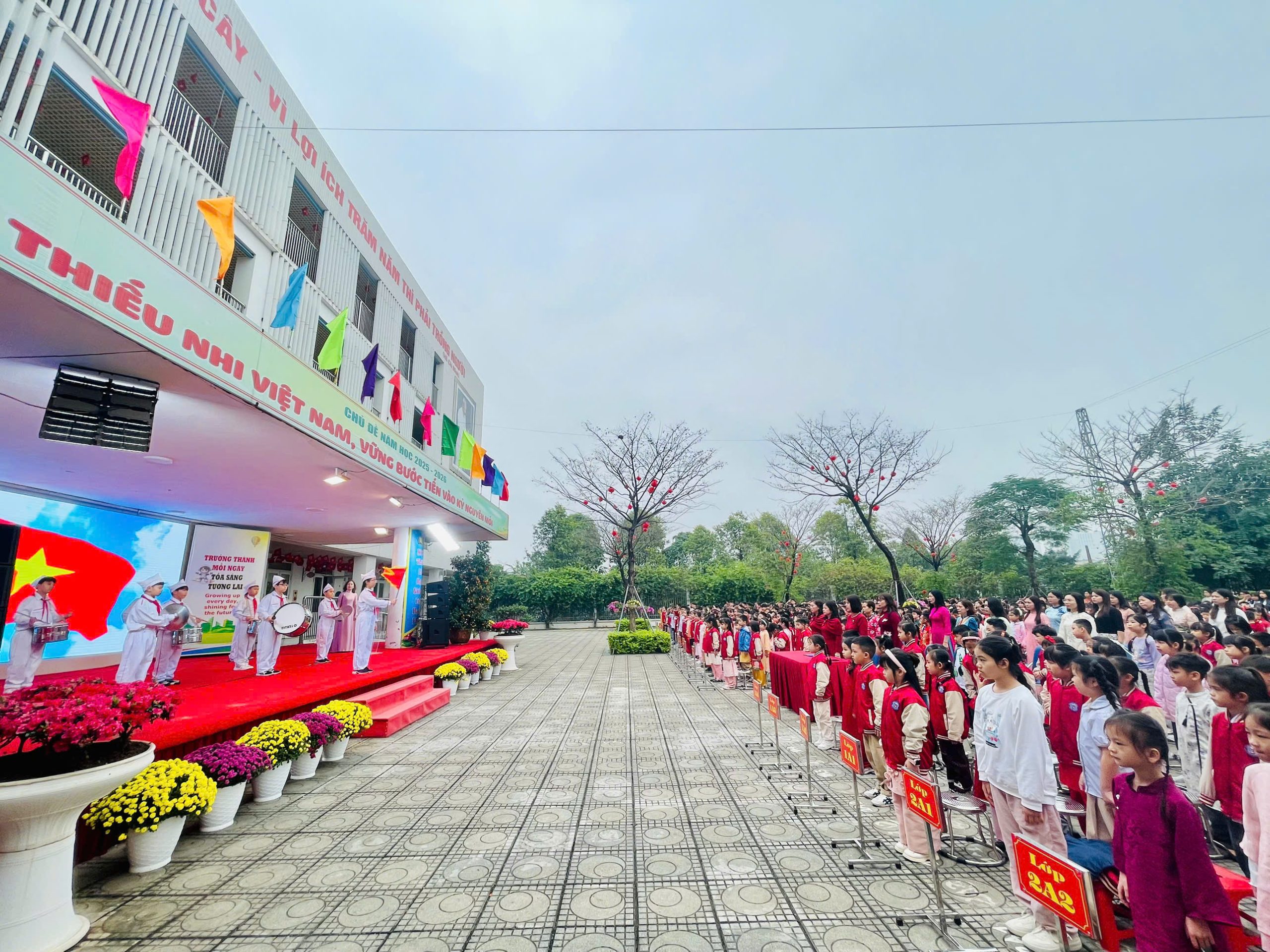Chương trình mở đầu bằng nghi thức chào cờ trang trọng. Trong không khí thiêng liêng, thầy cô và các em học sinh cùng hướng về lá cờ Tổ quốc, thể hiện niềm tự hào và quyết tâm học tập, rèn luyện thật tốt trong năm mới.