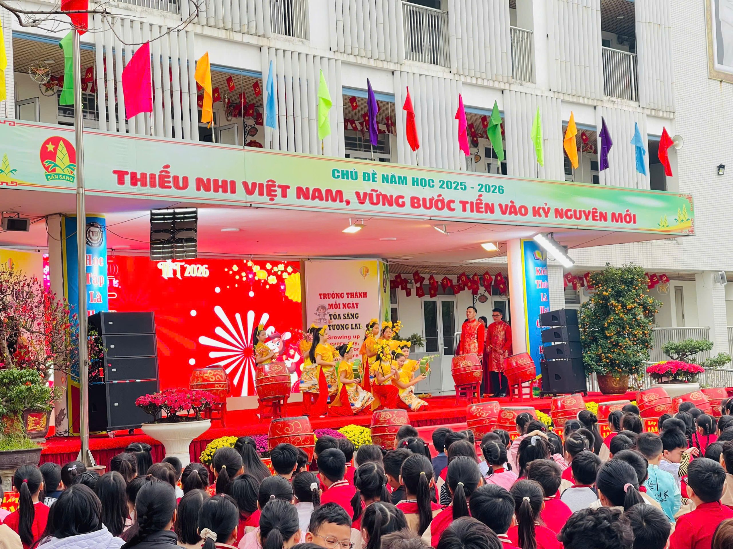 Tiếng trống chào đón năm mới của các thầy cô giáo và những điệu múa ngập tràn sắc xuân của các em học sinh gửi gắm lời chúc năm mới an khang – hạnh phúc đến thầy cô và bạn bè.