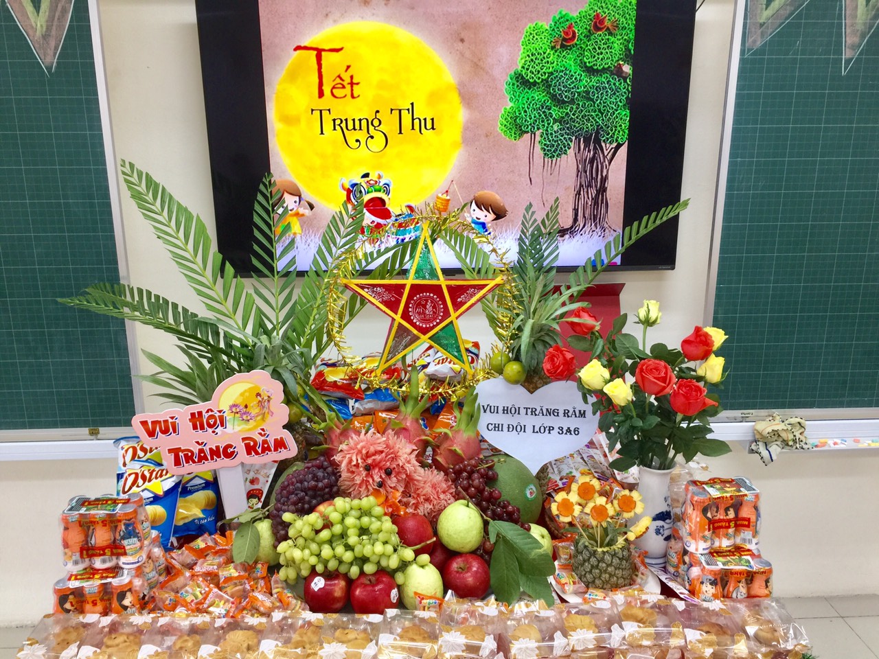 Những mâm cỗ Trung thu được trang trí với đủ sắc màu rất đẹp mắt, công phu và tỉ mỉ mang đậm ý nghĩa và biểu tượng về ngày Trung thu. Mỗi lớp một mâm cỗ lung linh sắc màu, một ý tưởng khác nhau nhưng đều mang một cảm giác thân quen và ấm cúng.