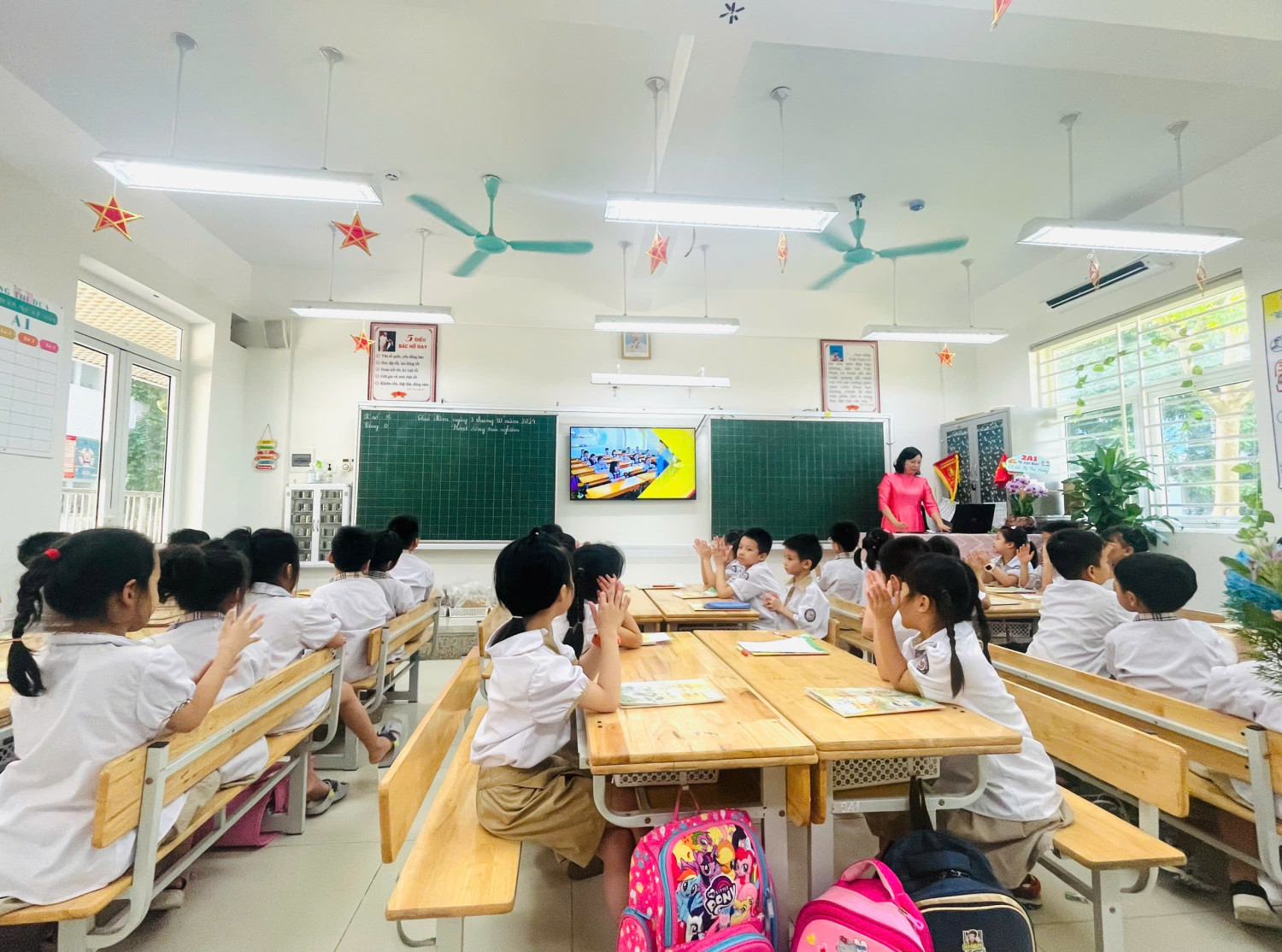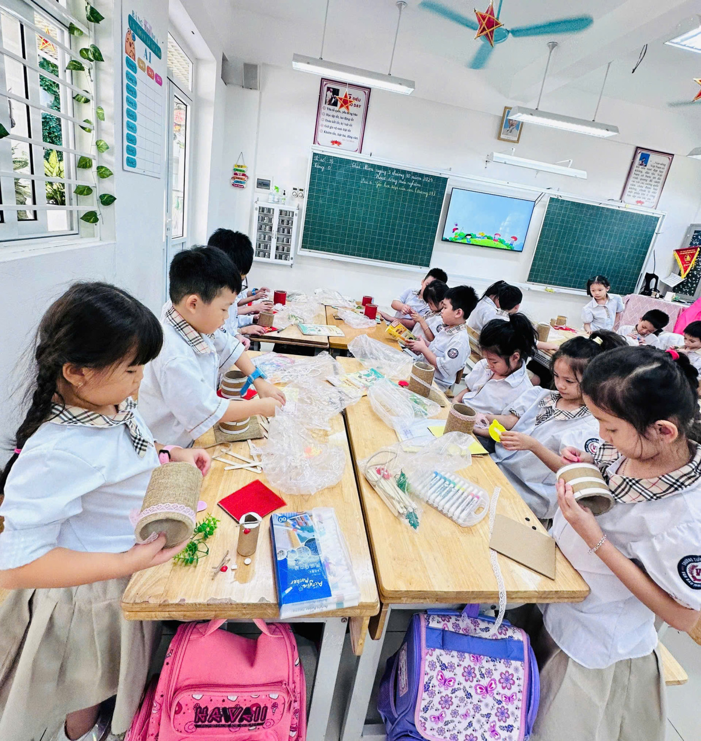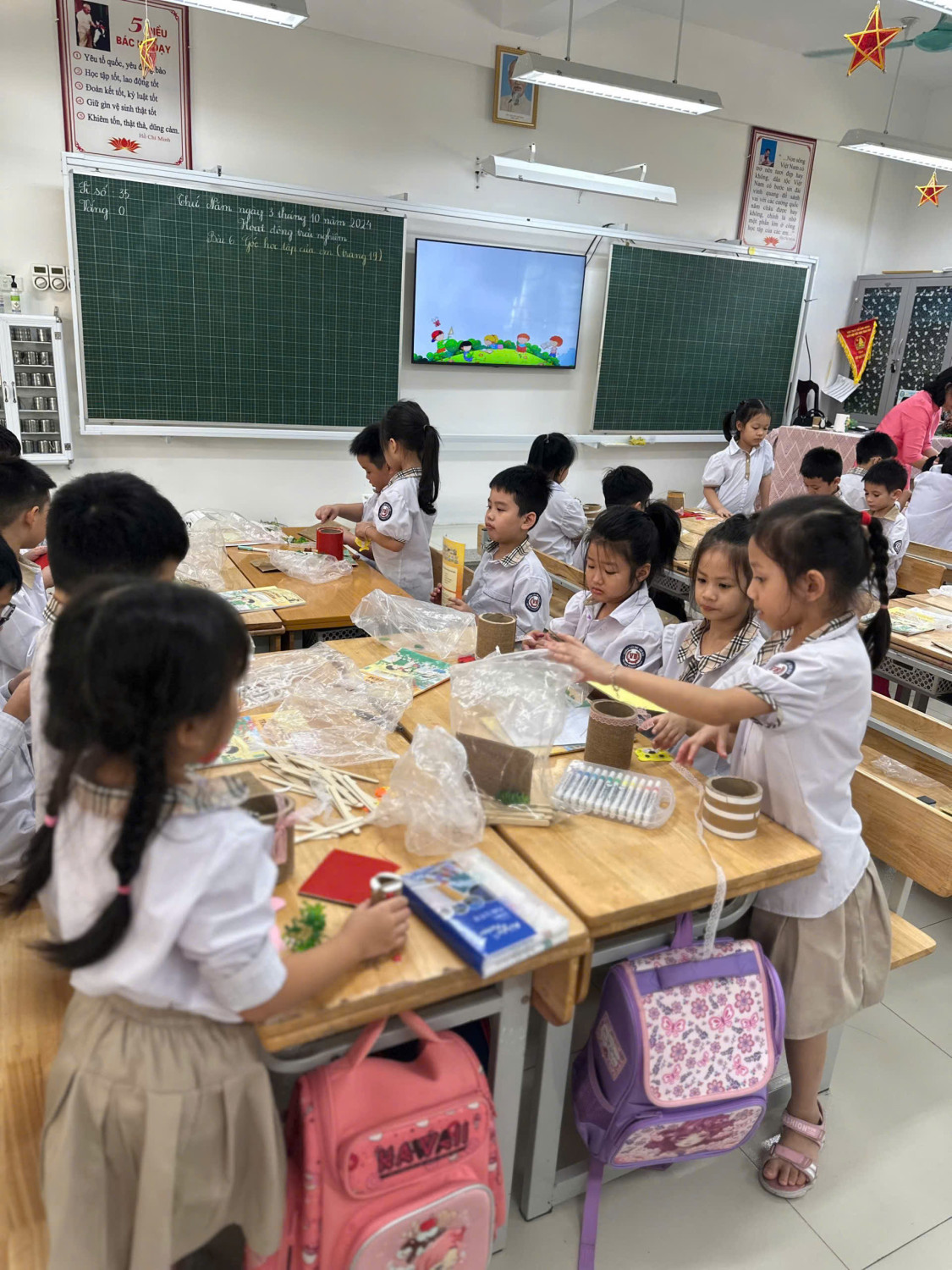 Tiết chuyên đề Hoạt động trải nghiệm, bài 6 “Góc học tập của em” của cô giáo Đỗ Thị Thu Hằng, lớp 2A1 trường Tiểu học Vạn Bảo đã thể hiện việc tích cực đổi mới phương, hình thức dạy học, tiết dạy diễn nhẹ nhàng, hiệu quả. Bước đầu cô đã giúp cho học sinh hiểu được ý nghĩa của sắp xếp gọn gàng góc học tập hằng ngày ở trường cũng như ở nhà, cách giữ gìn để đồ dùng học tập luôn được mới, đẹp và sử dụng được nhiều năm, tiếp theo cô hướng dẫn học sinh các bước để làm tạo ra đồ dùng để đựng đồ dùng học tập từ vỏ chai nhựa, lõi giấy vệ sinh, thanh gỗ nhỏ, giấy màu, hồ dán …. Với sự sáng tạo, khéo léo các em học sinh tự làm ra các sản phẩm để đựng đồ dùng học tập đẹp, xinh xắn. Trong tiết chuyên đề học sinh tích cực tham ra các hoạt động; trao đổi, thảo luận sôi nổi; chia sẻ và hợp tác với nhau thực hiện tốt nhiệm vụ học tập. Dưới đây là một số hình ảnh của cô trò trong tiết dạy chuyên đề.