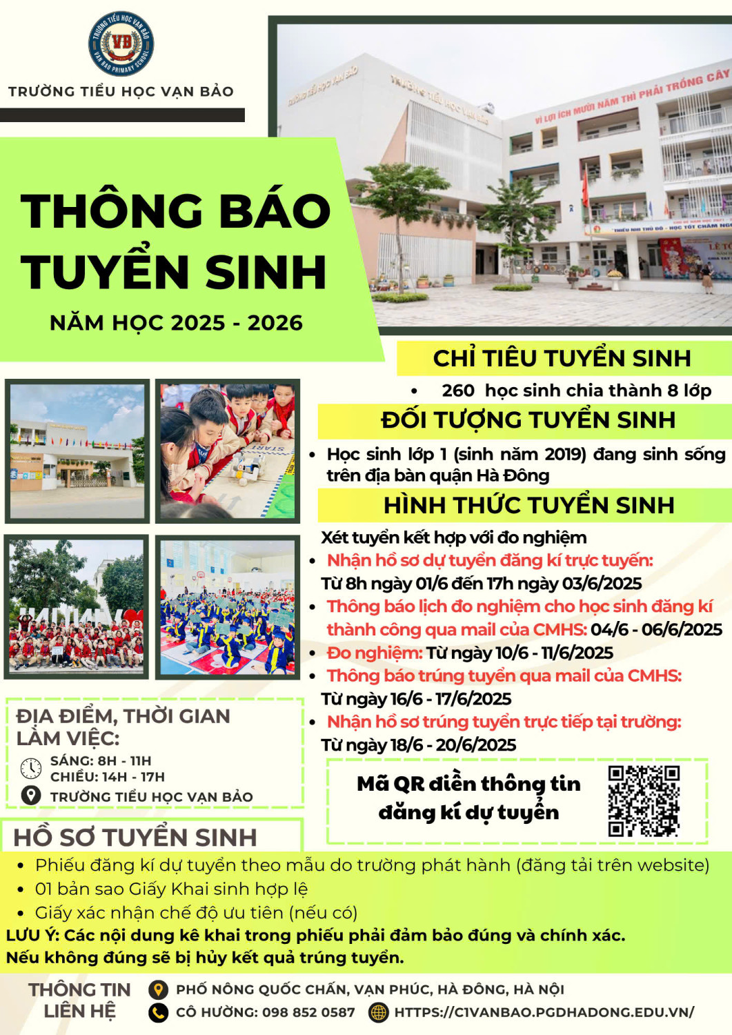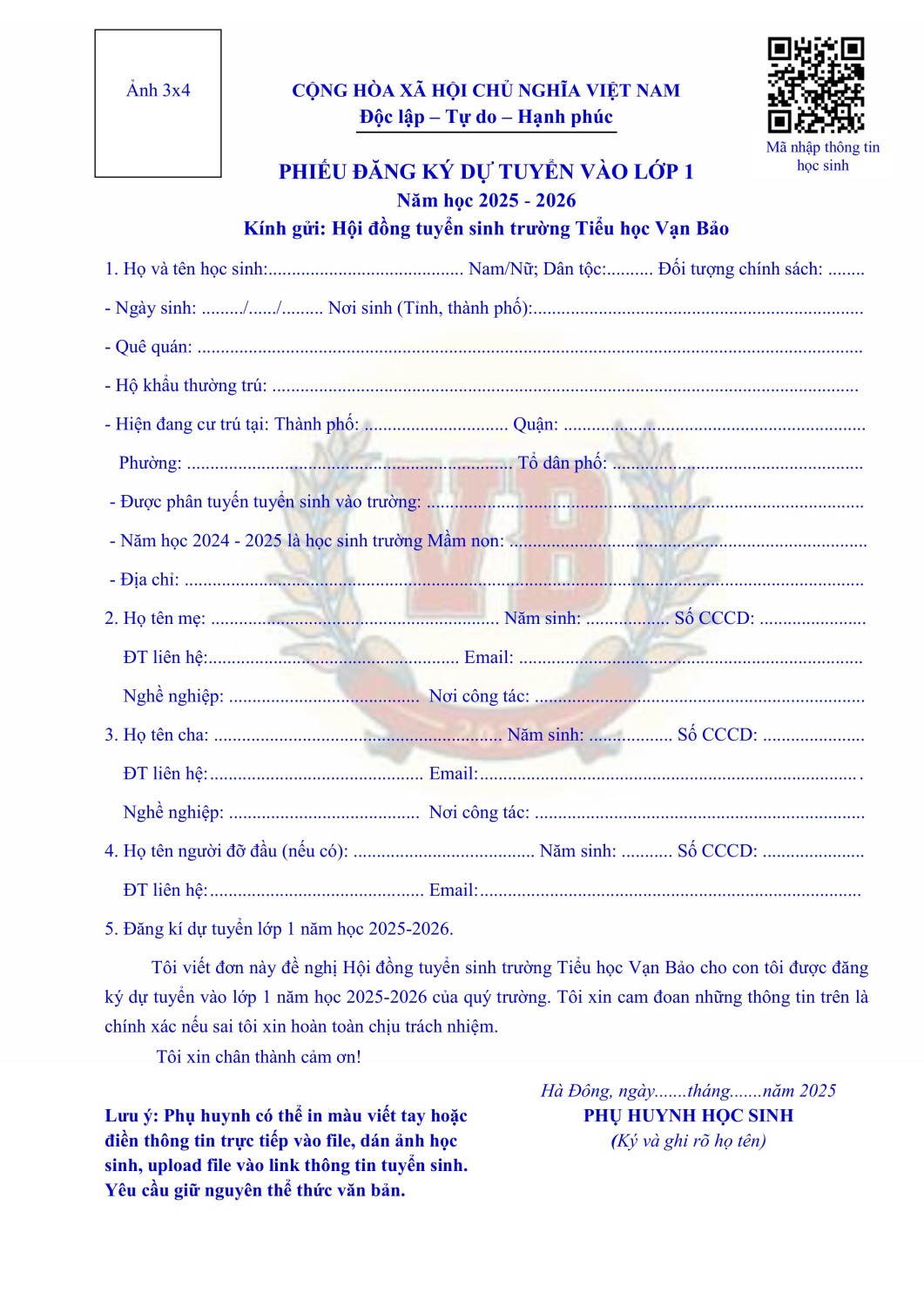 THÔNG BÁO TUYỂN SINH: MẪU PHIẾU ĐĂNG KÝ DỰ TUYỂN VÀO LỚP 1 VÀ LINK ĐĂNG KÝ THÔNG TIN DỰ TUYỂN NĂM HỌC 2025-2026
