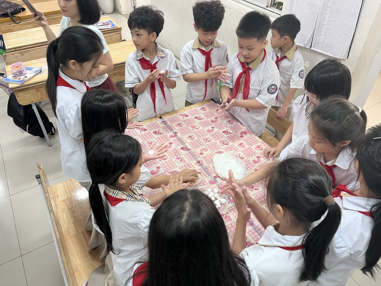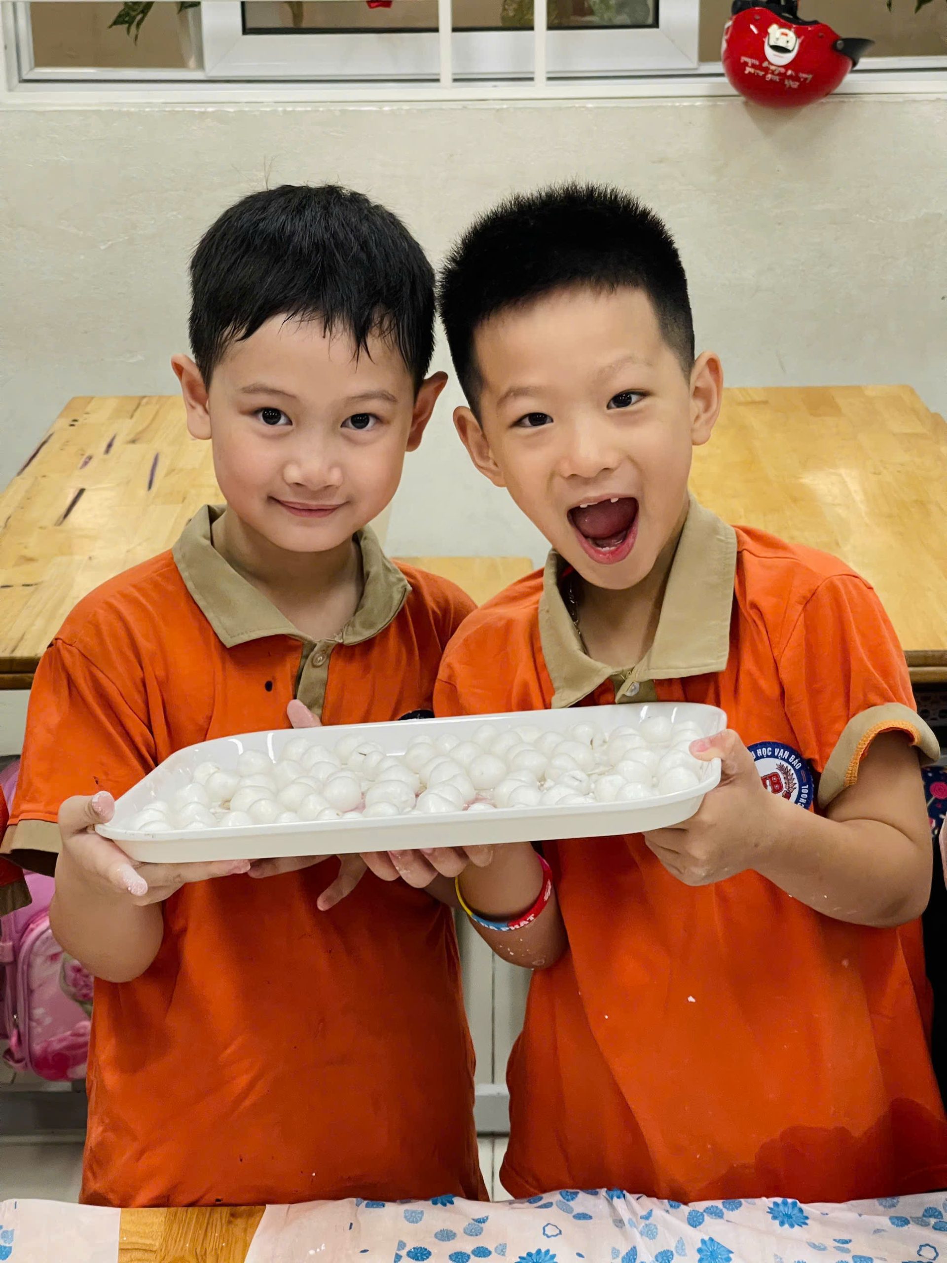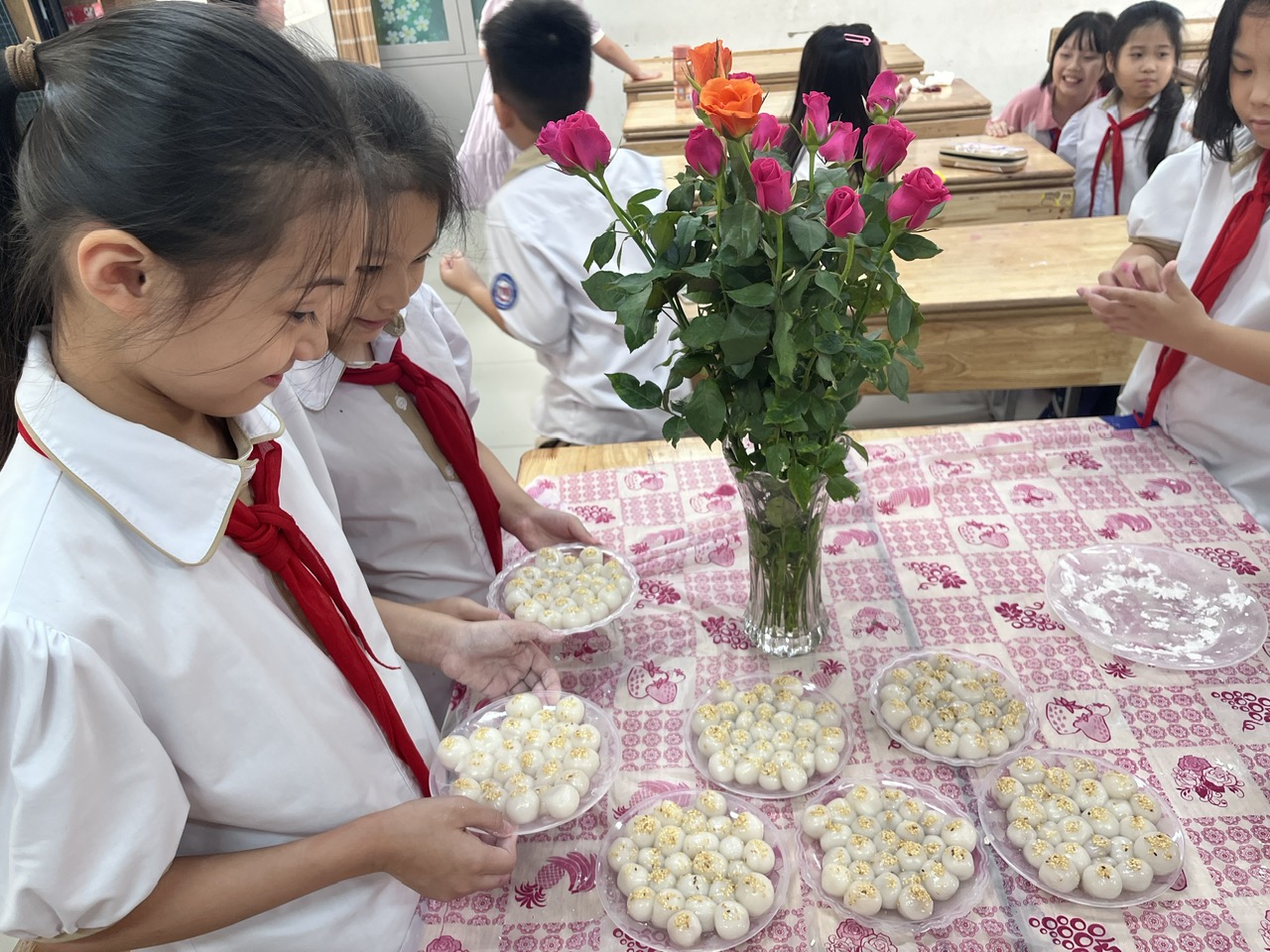Những viên bánh tròn xinh, trắng ngần không chỉ là thành quả của sự khéo léo mà còn chứa đựng niềm vui, sự háo hức và tinh thần gắn kết của các em học sinh.