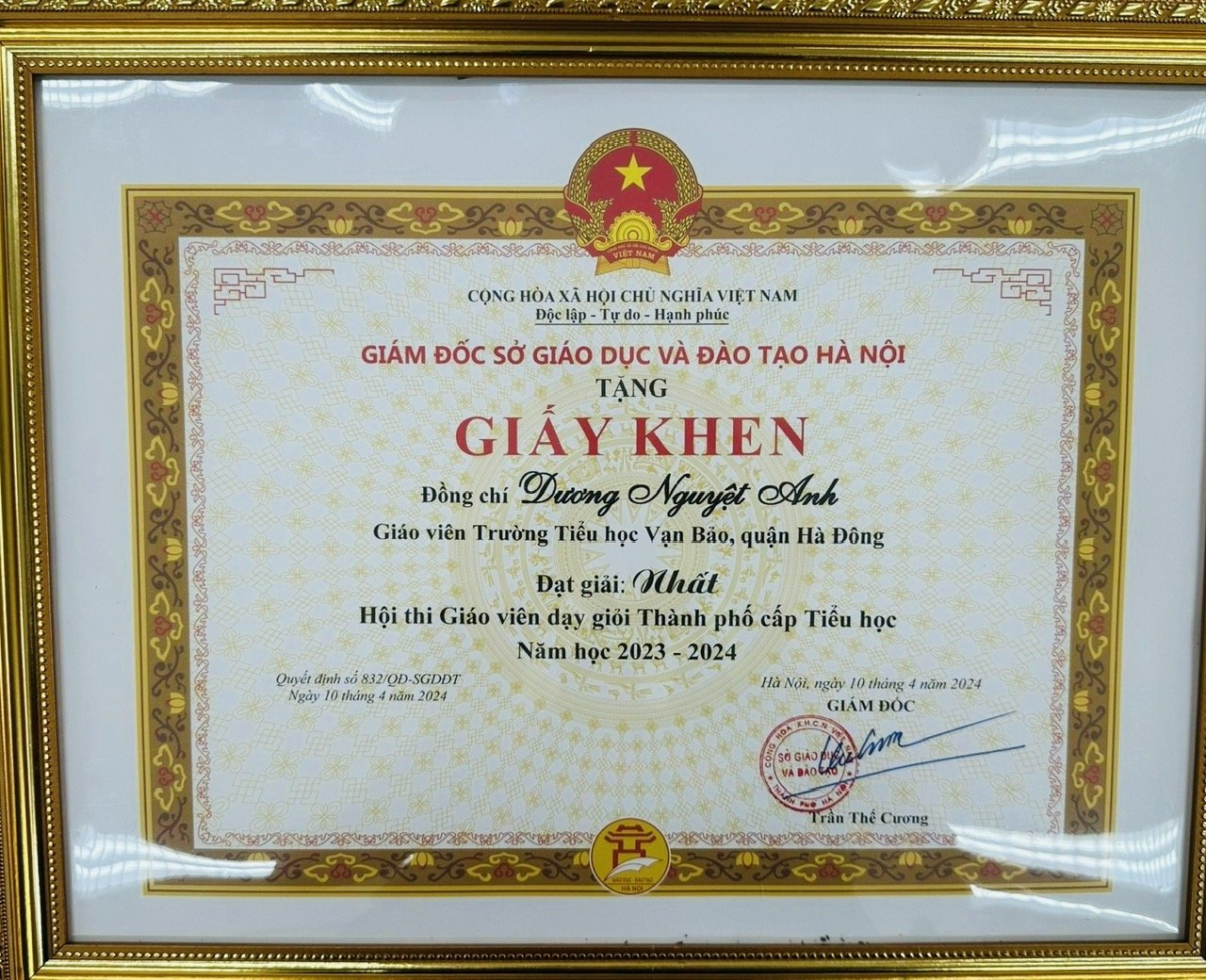 🌷 🌷 🌷 Sáng ngày 11/4/2024 Sở Giáo dục và Đào tạo thành phố Hà Nội tổ chức tổng kết Hội thi GVG cấp thành phố năm học 2023 – 2024. Cô giáo Dương Nguyệt Anh, Trường Tiểu học Vạn Bảo rất vinh dự nhận giấy khen đạt giải Nhất cấp thành phố. Thành tích trên là động lực để tập thể nhà trường tiếp tục cố gắng hơn nữa trong sự nghiệp Giáo dục của những năm tiếp theo. 🍁 🍁 🍁