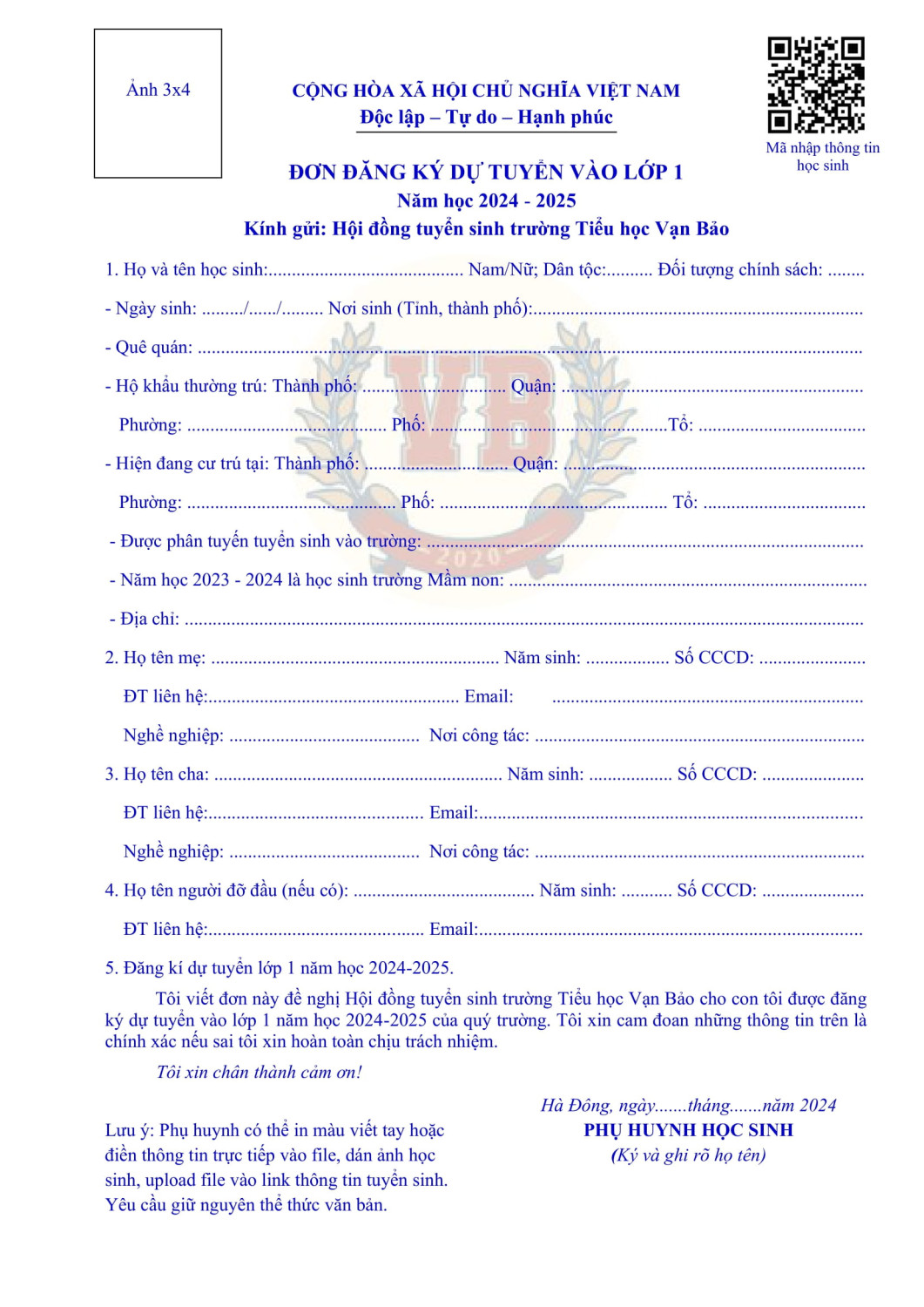 MẪU ĐƠN ĐĂNG KÝ DỰ TUYỂN VÀO LỚP 1 VÀ LINK ĐĂNG KÝ THÔNG TIN DỰ TUYỂN NĂM HỌC 2024-2025