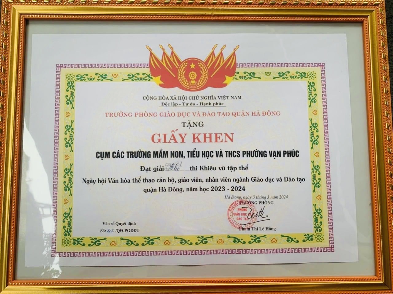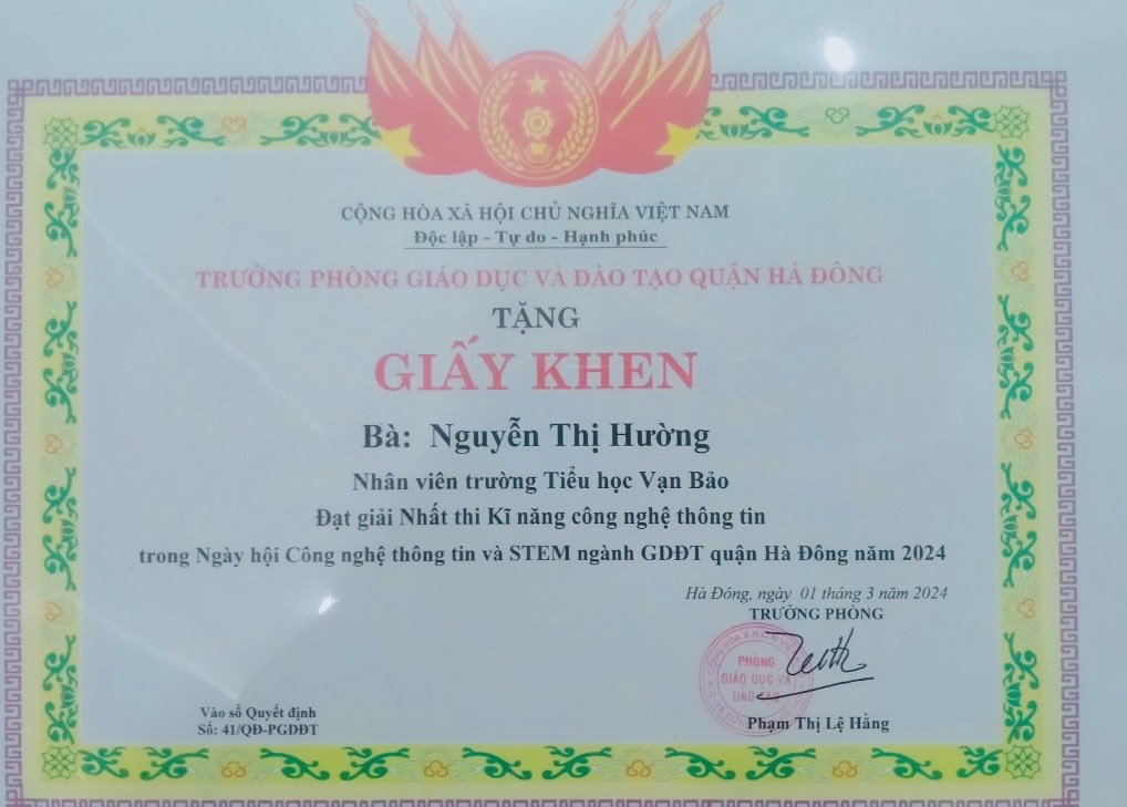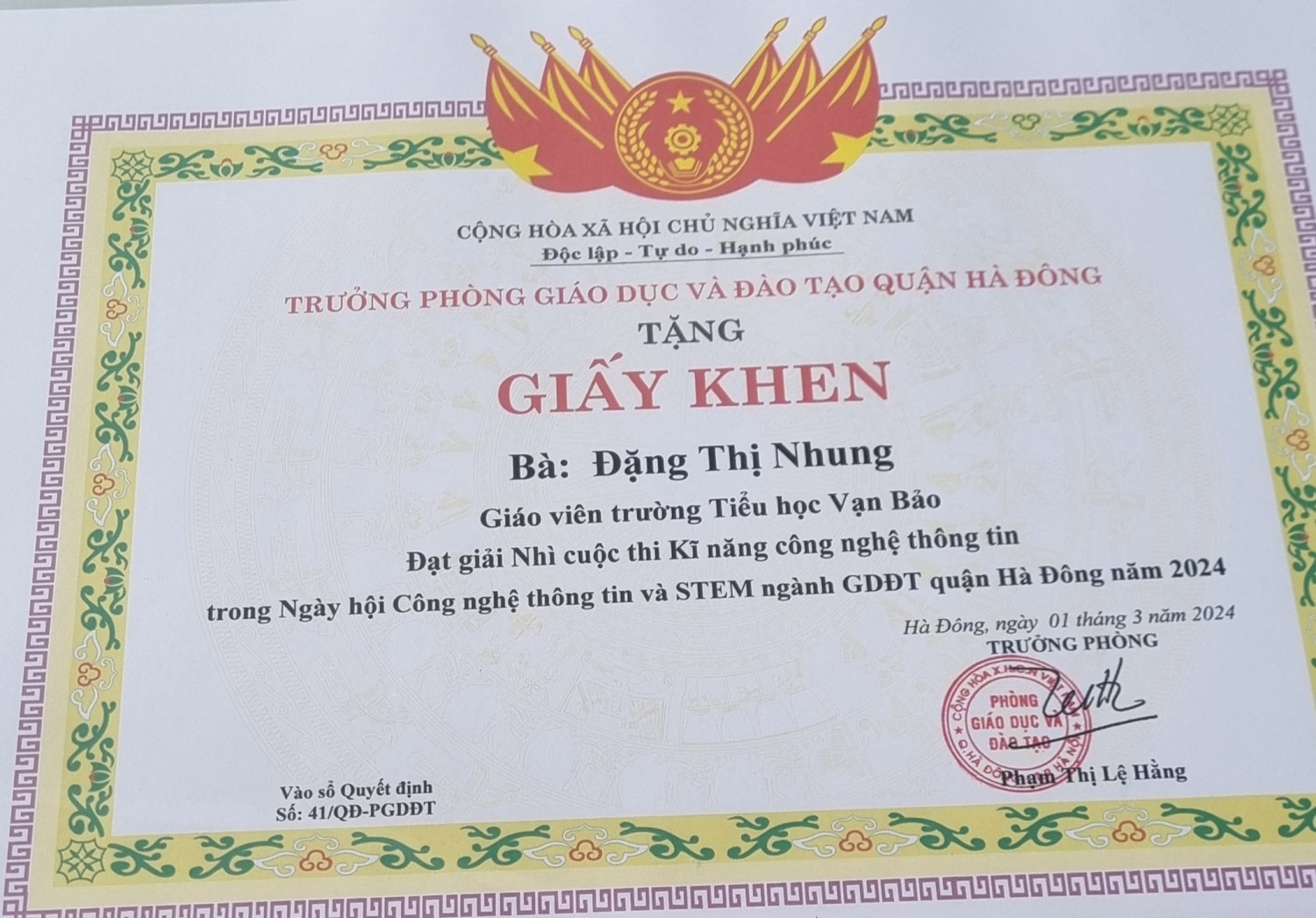 💐💐💐 Xin chúc mừng những thành tích khối giáo dục phường Vạn Phúc, cá nhân giáo viên, nhân viên của nhà trường trong ngày hội “Công nghệ thông tin – STEM – Văn hóa thể thao” ngành Giáo dục và Đào tạo quận Hà Đông năm 2024.