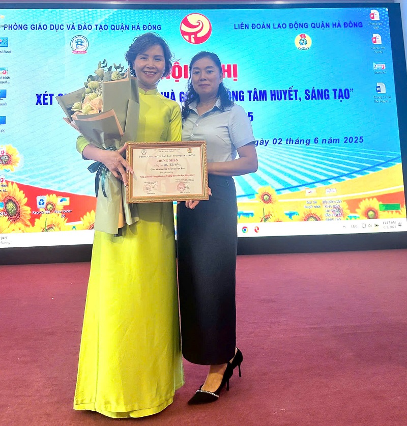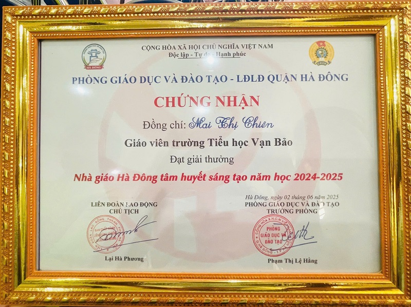 Cô Mai Thị Chiên là một trong những tấm gương sáng về lòng nhiệt huyết và sáng tạo trong công tác giáo dục, hoạt động Đội. Với vai trò là Tổng phụ trách Đội, cô luôn tận tâm, tận lực để xây dựng môi trường học tập và rèn luyện năng động, sáng tạo cho học sinh trường Tiểu học Vạn Bảo. Trong suốt quá trình công tác, cô Mai Thị Chiên không ngừng đổi mới phương pháp hoạt động Đội, mang đến nhiều chương trình ý nghĩa, bổ ích, giúp học sinh rèn luyện kĩ năng sống, tinh thần đoàn kết và ý thức trách nhiệm. Nhờ những đóng góp xuất sắc và sự tâm huyết, cô đã được nhận giải thưởng “Nhà giáo tâm huyết, sáng tạo” năm học 2024-2025.