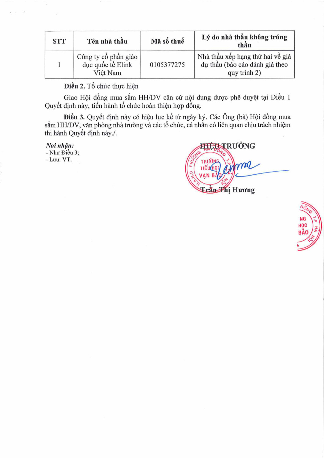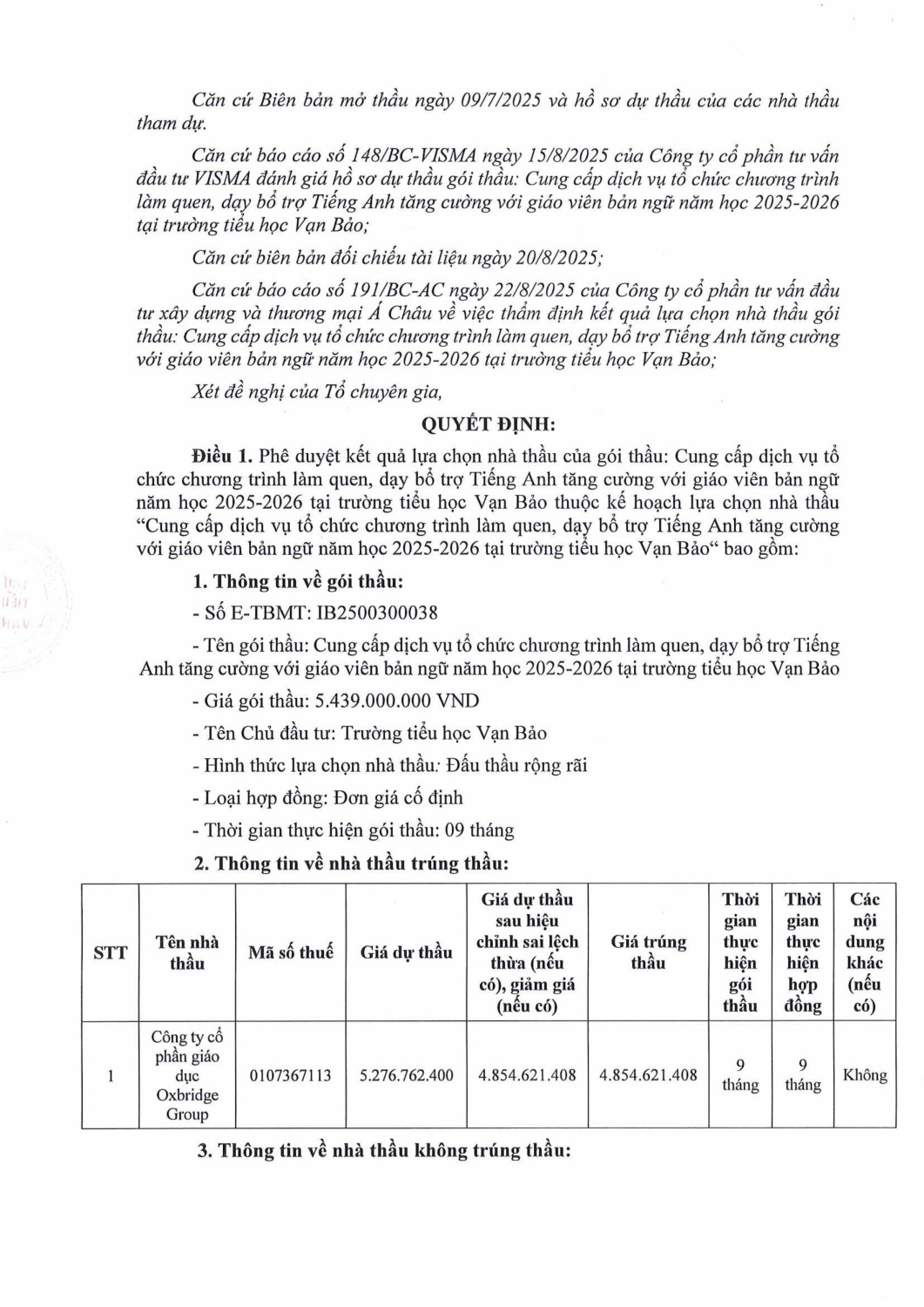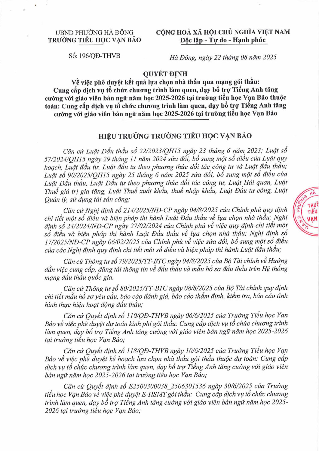 Quyết định về việc phê duyệt kết quả lựa chọn nhà thầu Gói thầu: Cung cấp dịch vụ tổ chức chương trình làm quen, dạy bổ trợ tiếng Anh tăng cường với giáo viên bản ngữ năm học 2025-2026 tại trường Tiểu học Vạn Bảo