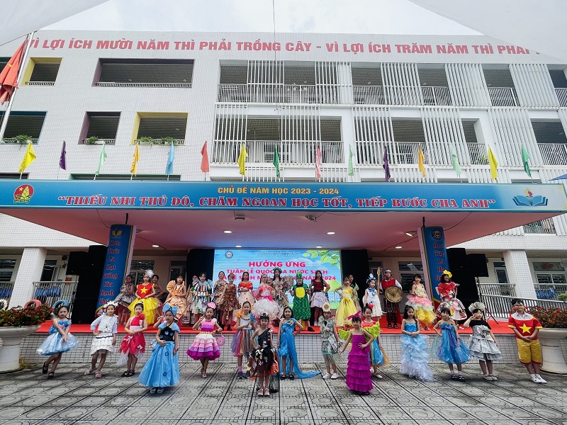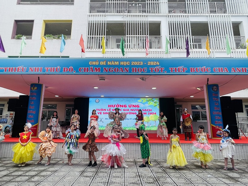 Màn biểu diễn thời trang từ những vật liệu tái chế với chủ đề “Chúng em bảo vệ môi trường”.