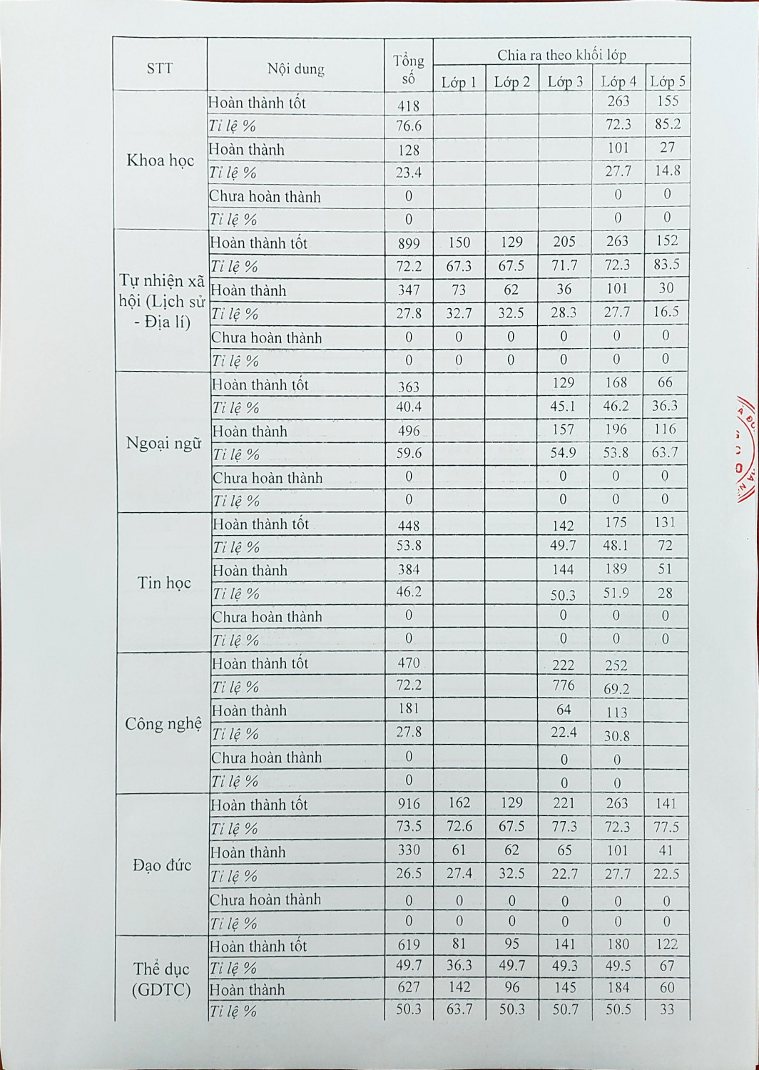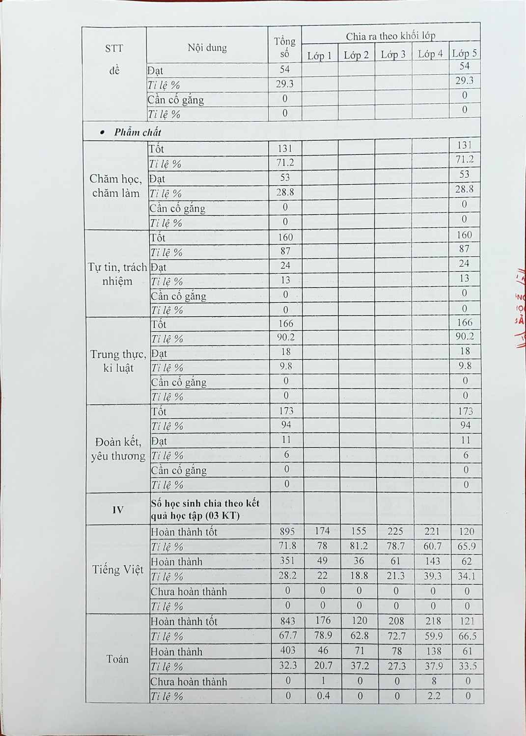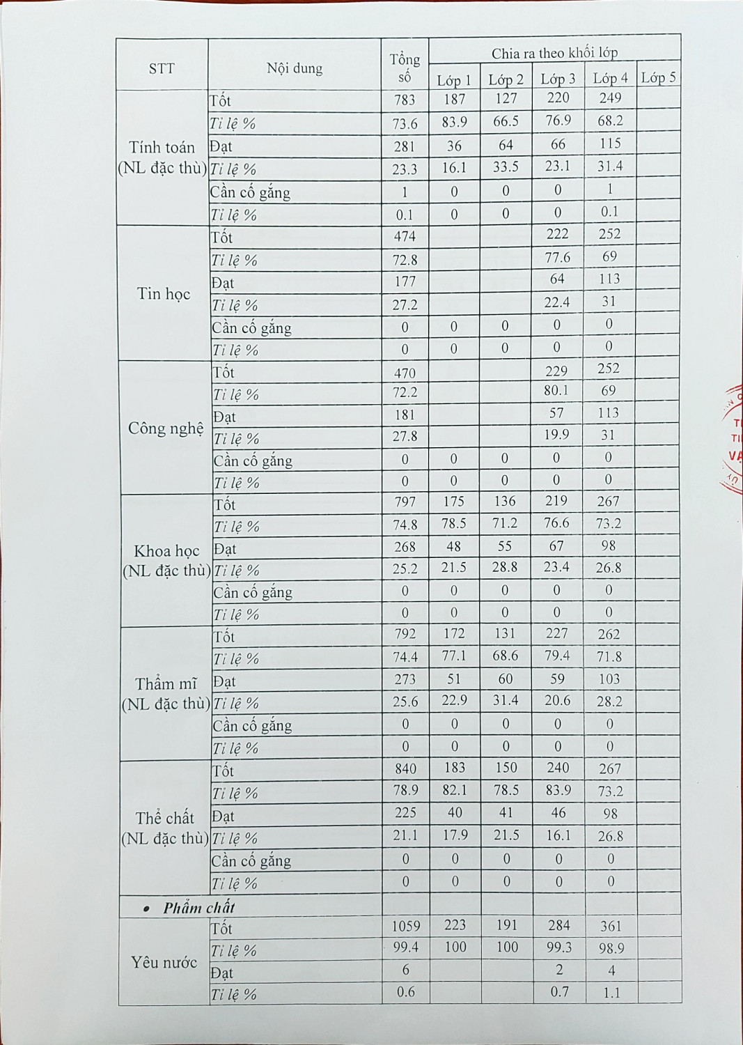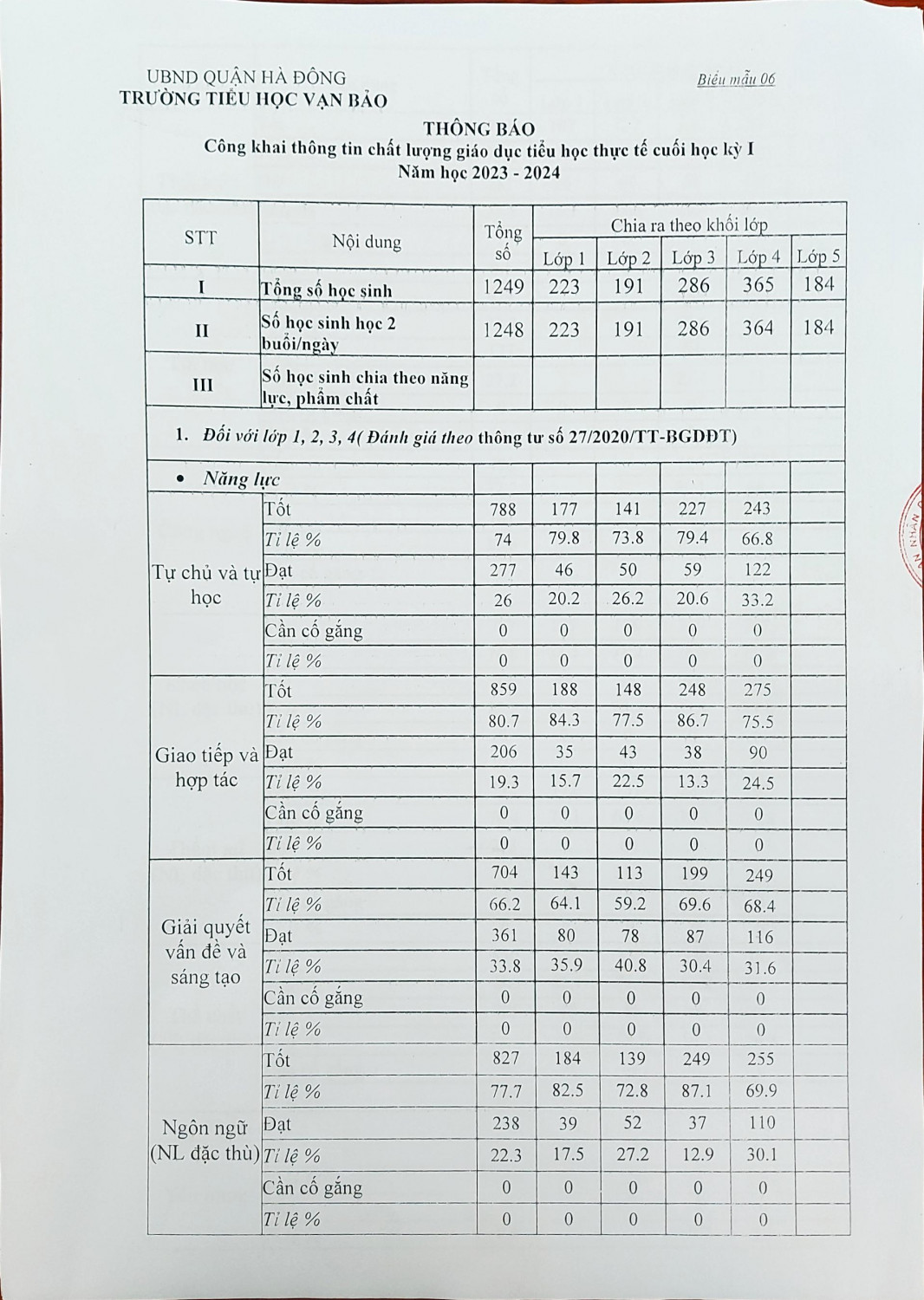 Thông báo công khai thông tin chất lượng giáo dục tiểu học thực tế cuối học kỳ I, năm học 2023-2024