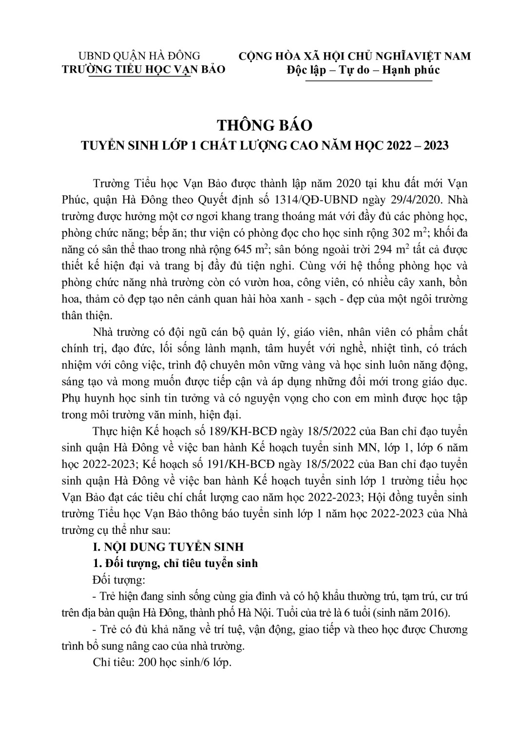 Thông báo tuyển sinh lớp 1 chất lượng cao năm học 2022-2023