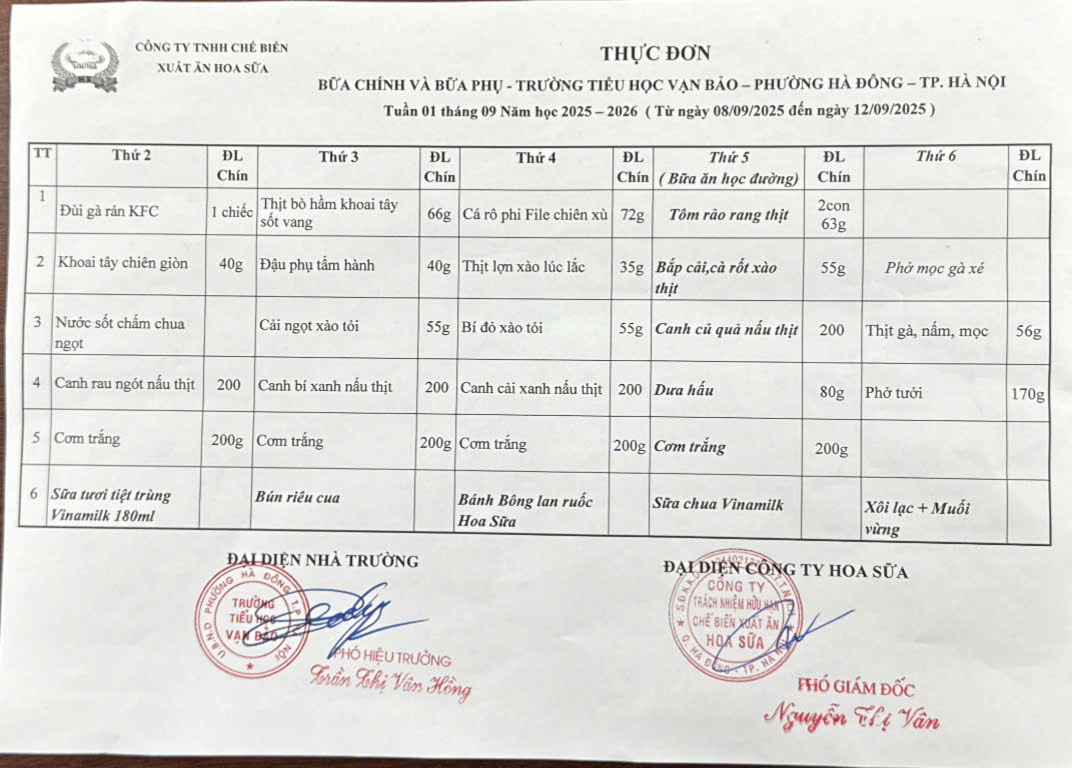 Thực đơn Tuần 1 thực hiện từ ngày 08/9/2025 đến 12/9/2025