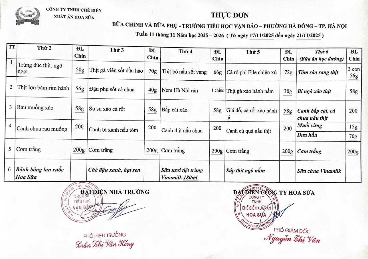 Thực đơn tuần 11 thực hiện từ ngày 16/11/2025 đến 21/11/2025