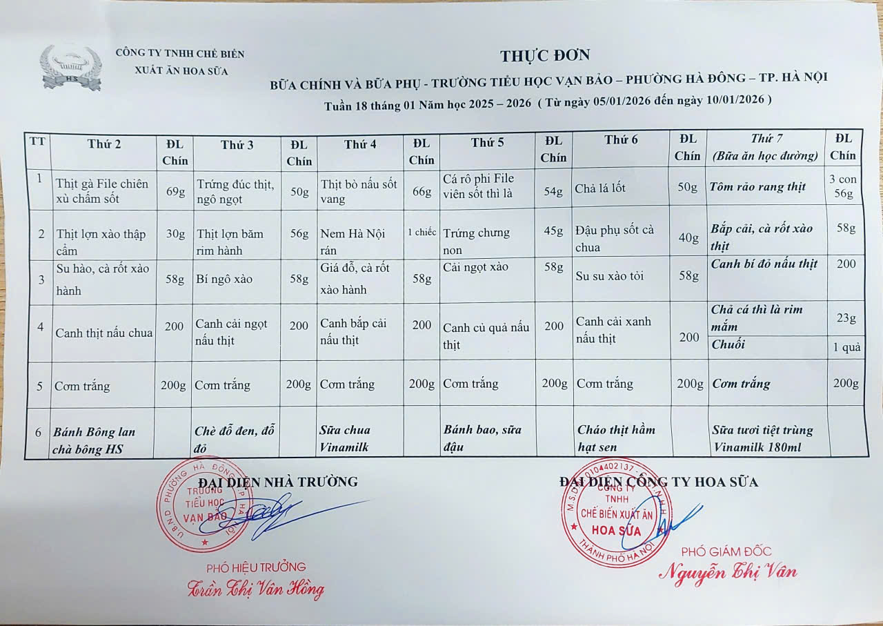 THỰC ĐƠN TUẦN 20 (từ 26/01 đến 30/01) Giới thiệu cssv bán trú 23/01/2026 Tác giả: Tiểu Học Vạn Bảo