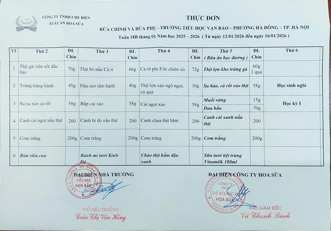 Thực đơn Tuần 18B thực hiện từ ngày 12/01/2026-15/01/2026 Thực đơn 10/01/2026 Tác giả: Tiểu Học Vạn Bảo