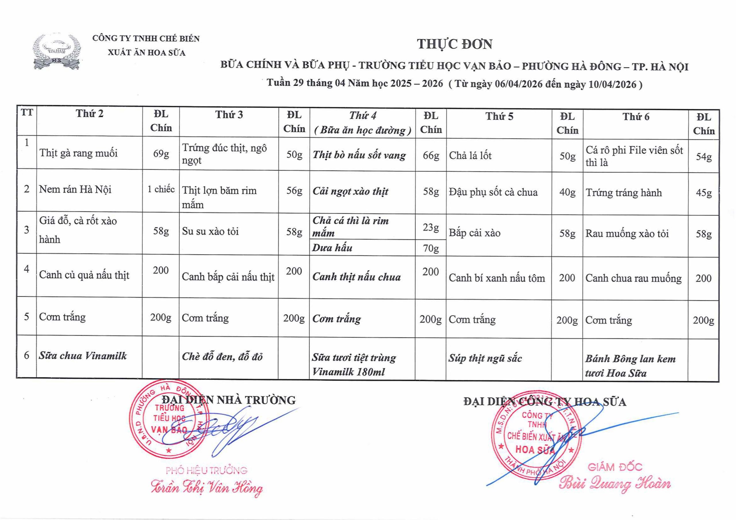 Thực đơn tuần 29 thực hiện từ ngày 06/4/2026 đến 10/4/2026