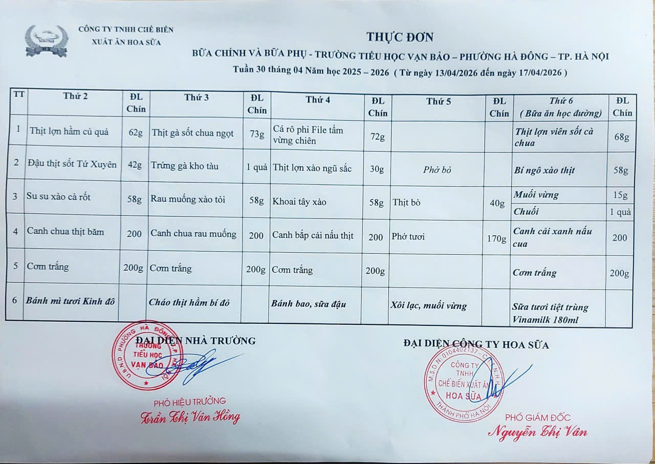 Thực đơn tuần 29 thực hiện từ ngày 06/4/2026 đến 10/4/2026 Thực đơn 03/04/2026 Tác giả: Tiểu Học Vạn Bảo