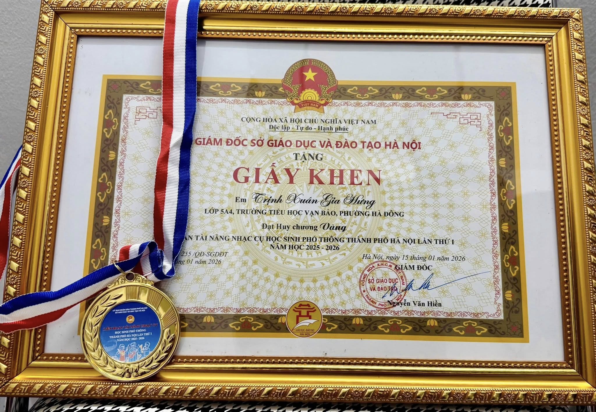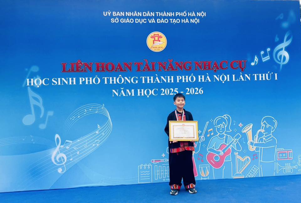 Chúc mừng em Trịnh Xuân Gia Hưng, học sinh lớp 5A4 đã xuất sắc đạt Huy chương Vàng – Liên hoan tài năng nhạc cụ học sinh phổ thông thành phố Hà Nội lần thứ I năm học 2025-2026.